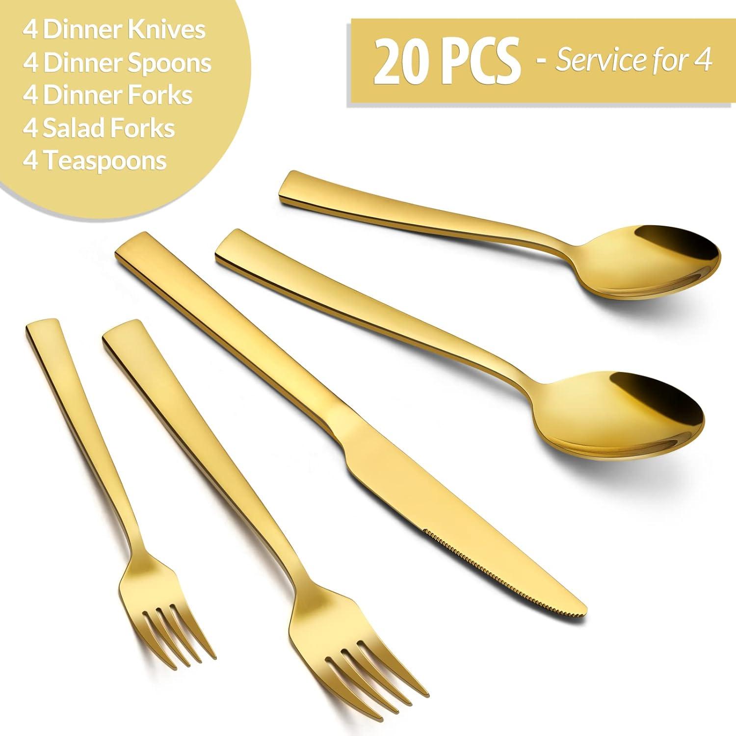 PREMIUM MATERIAL – Solid flatware set is constructed by high quality 18/0 stainless steel, Nickel free and rust resistance, Superior gold titanium coating won’t chip off, Healthy and durable for everyday use, Recommend hand washing for longer term use