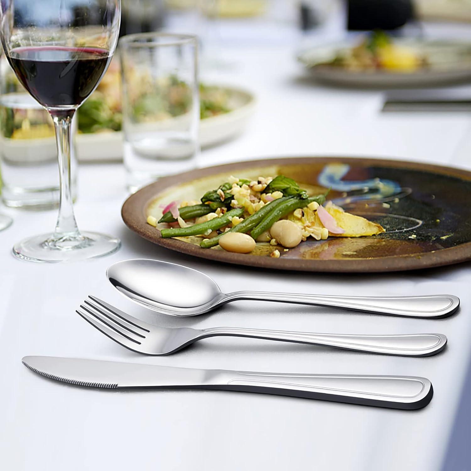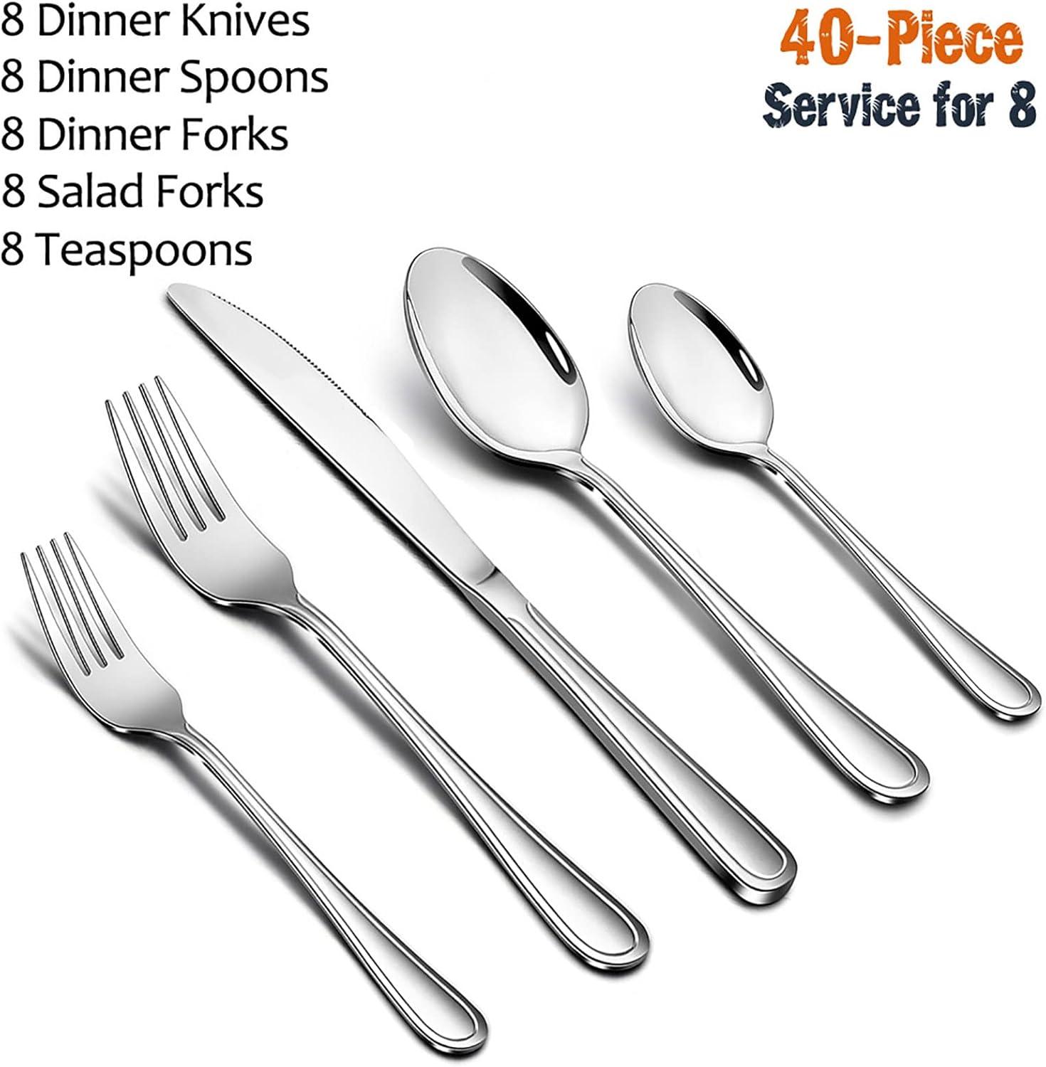 E-far 40-Piece Stainless Steel Silverware Flatware Set, includes 8 Dinner Knives, 8 Dinner Forks, 8 Dessert Forks, 8 Dinner Spoons and 8 Teaspoons, which is made of 18/0 stainless steel to ensure health and durability and knives made of 18/0 hard Stainless Steel to ensure sharpness. High hardness, not blend or break. Classic and modern design is timeless. Smooth edge and proper weight is comfortable for adults and big children. Quantity of 40 pieces is perfect for daily use, family gathering, entertaining, buffet, party.
