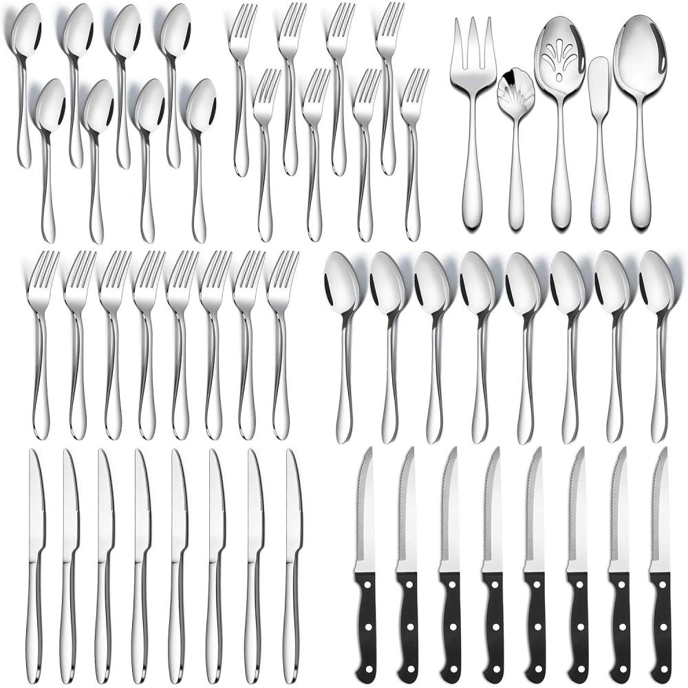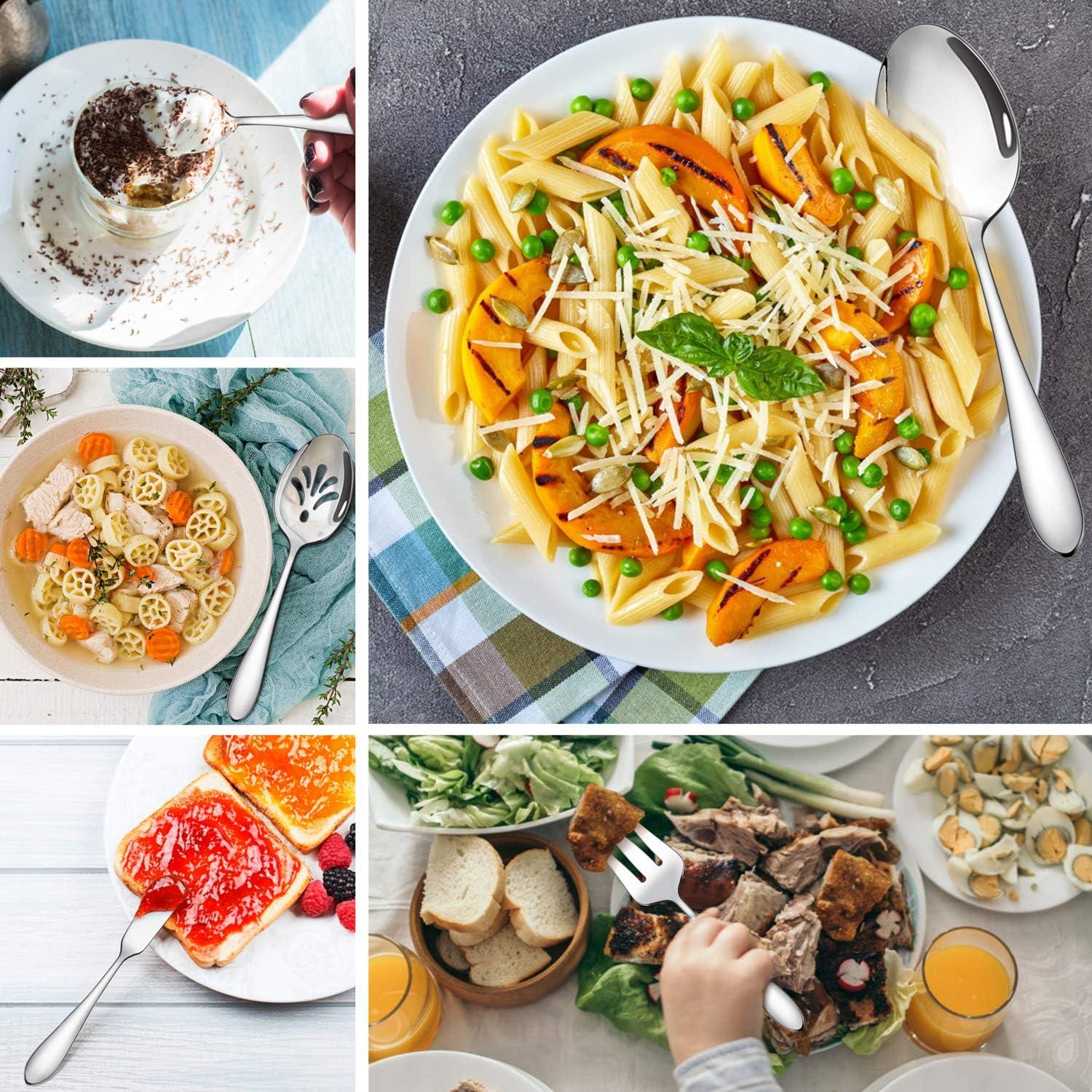 SERVICE FOR 8 – This bulk silverware set includes 8 Dinner Knives, 8 Dinner Forks, 8 Dinner Spoons, 8 Teaspoons, 8 Salad Forks, 8 Steak Knives, Additional 5 Hostess Service Set, Provides you with all you need to have a great dinner