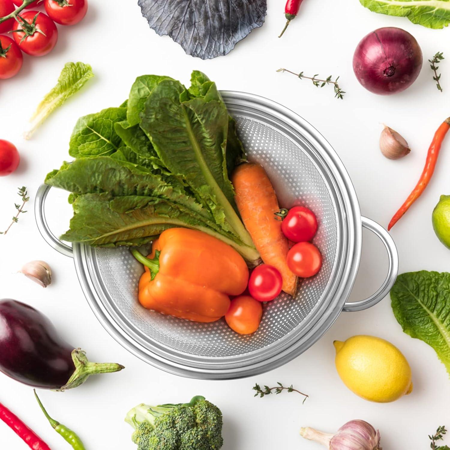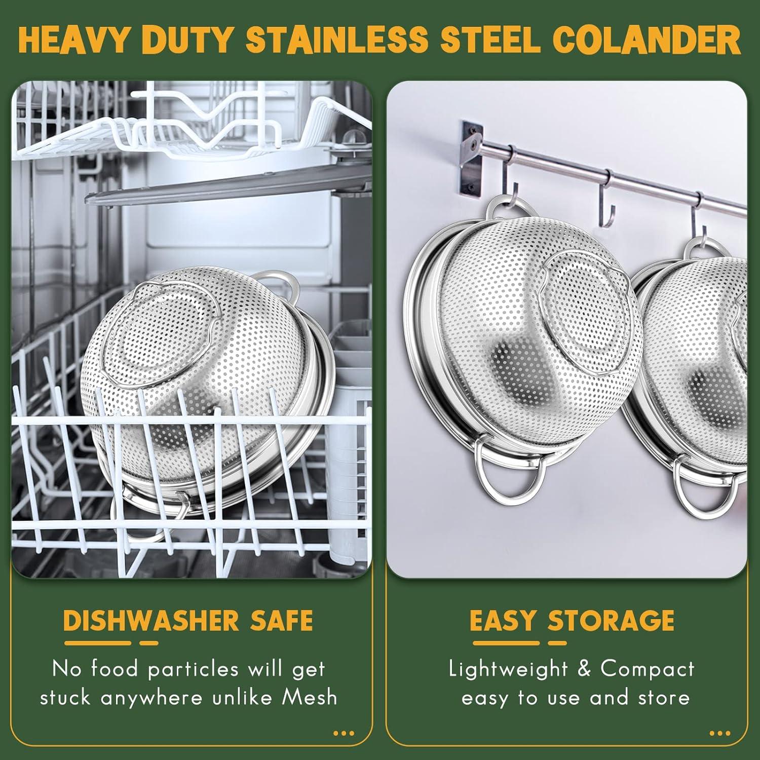 HEAVY HANDLES – D-shaped handles are solidly welded for easy lifting and transportation, Allow you to place this colander in a mixing bowl for draining, Also can be used as hooks for hanging during storage, which will help save space and declutter your kitchen counters