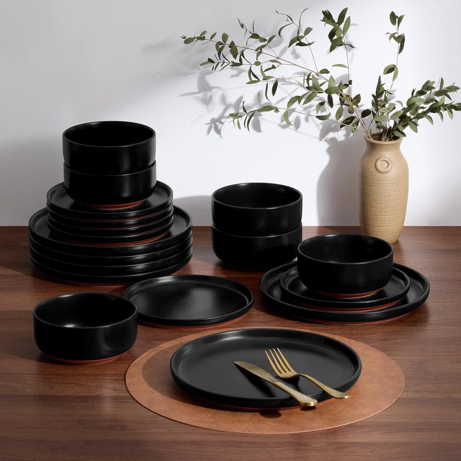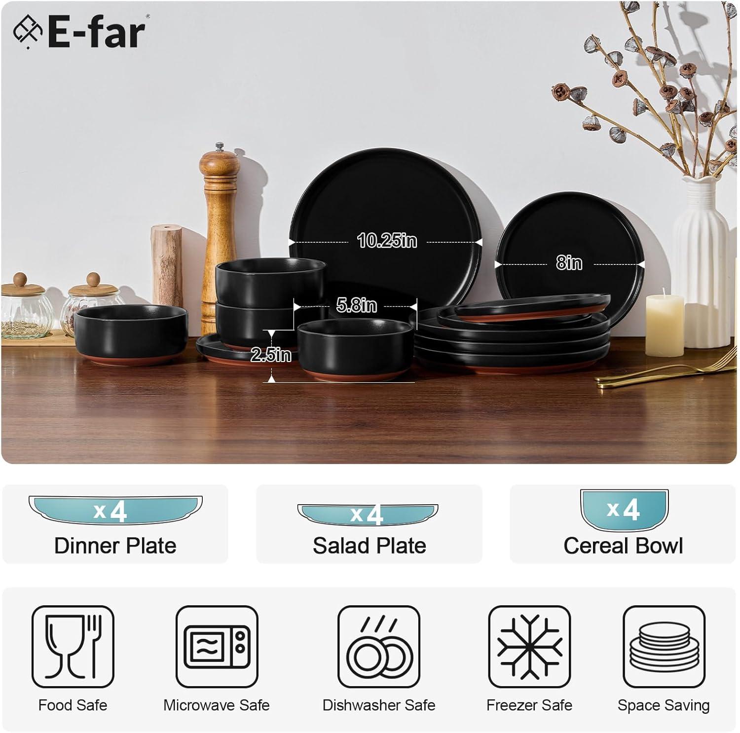 image:imageEfar 12Piece Stoneware Dinnerware Sets Plates and Bowls Sets for 4 Ceramic Dishware Dishes Set with Terracotta Base Chip amp Scratch Resistant Microwave amp Dishwasher Safe Speckled WhiteMatte Black