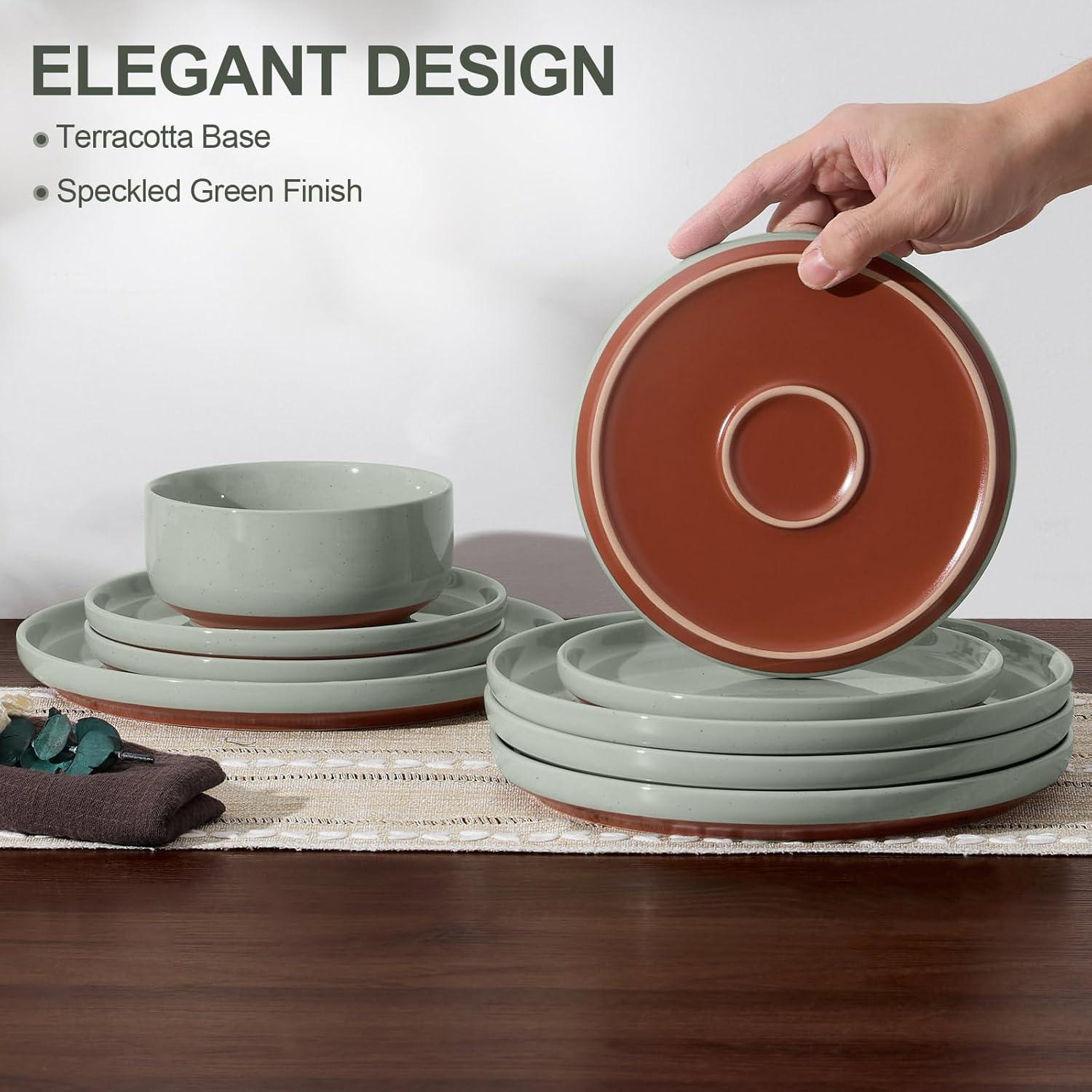 image:imageEfar 12Piece Stoneware Dinnerware Sets Plates and Bowls Sets for 4 Ceramic Dishware Dishes Set with Terracotta Base Chip amp Scratch Resistant Microwave amp Dishwasher Safe Speckled WhiteSage Green