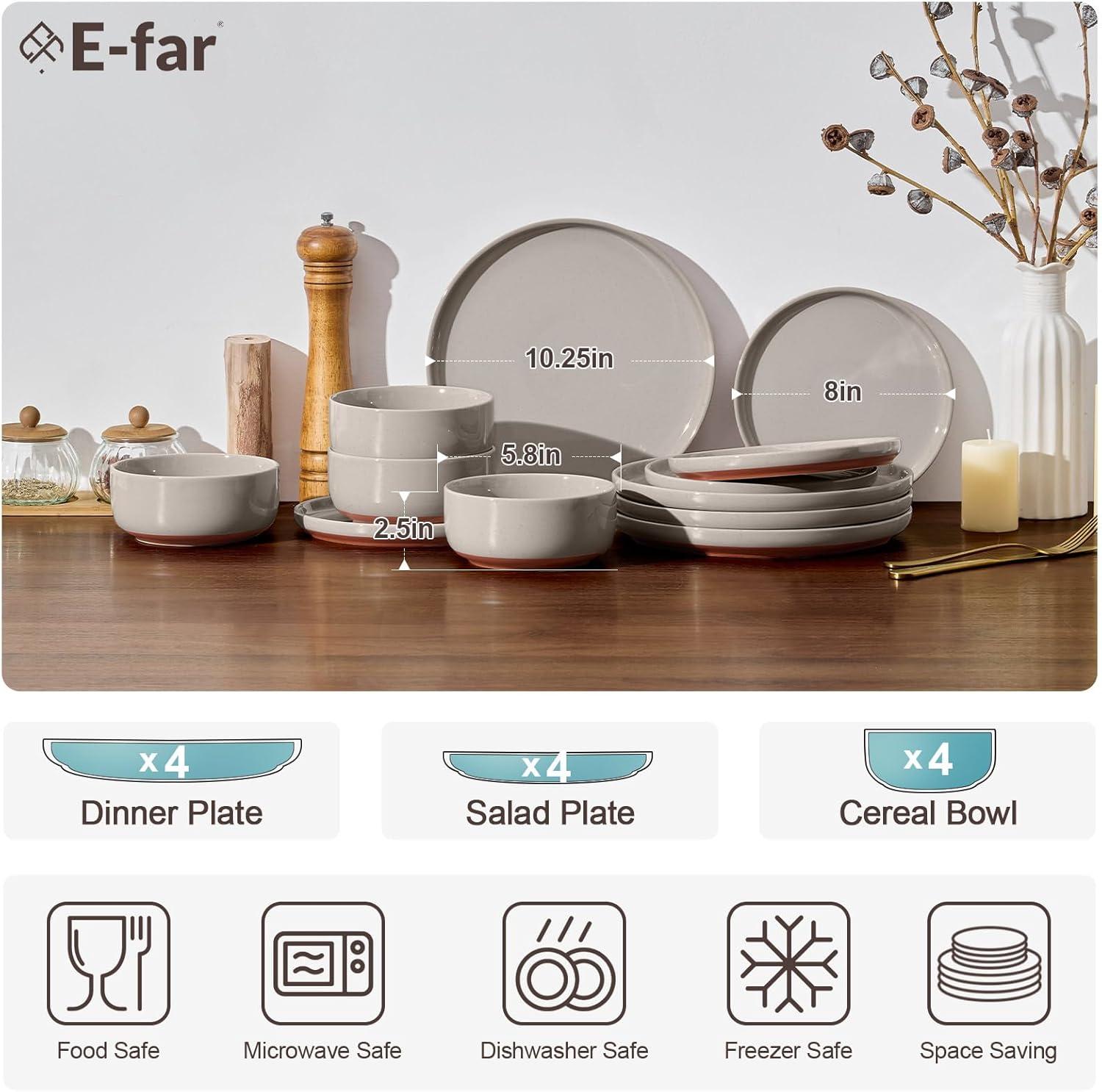 E-far 12-Piece Stoneware Dinnerware Sets, Plates and Bowls Sets for 4, Ceramic Dishware Dishes Set with Terracotta Base, Chip & Scratch Resistant, Microwave & Dishwasher Safe, Speckled White(Warm Taupe)