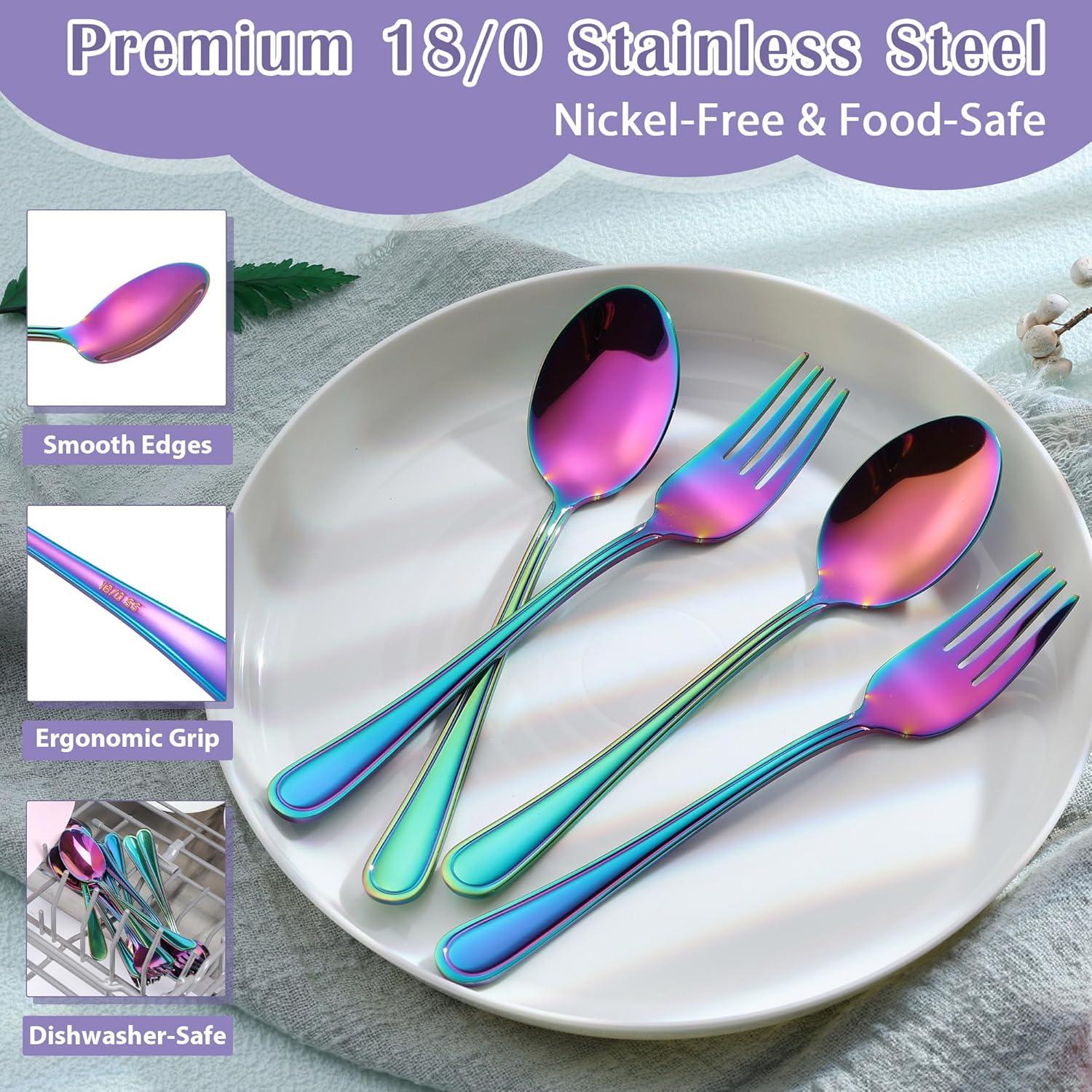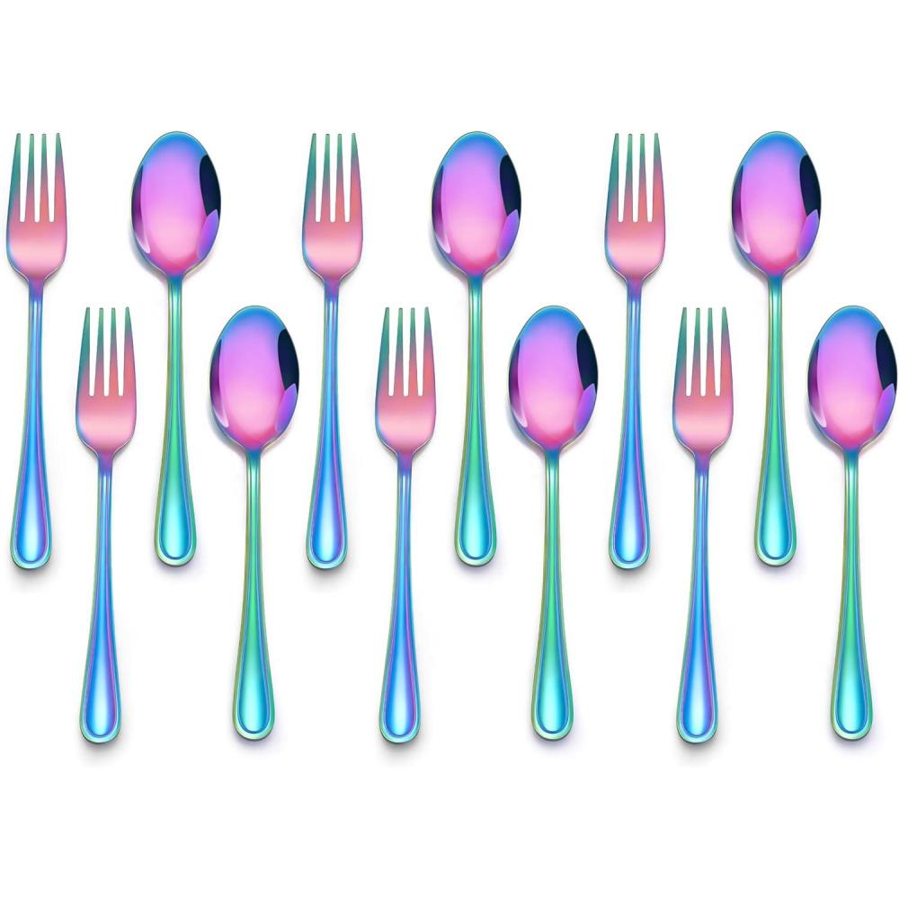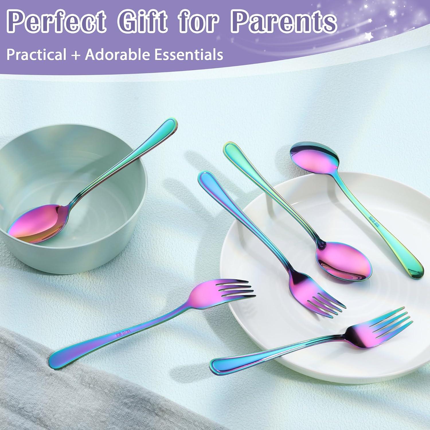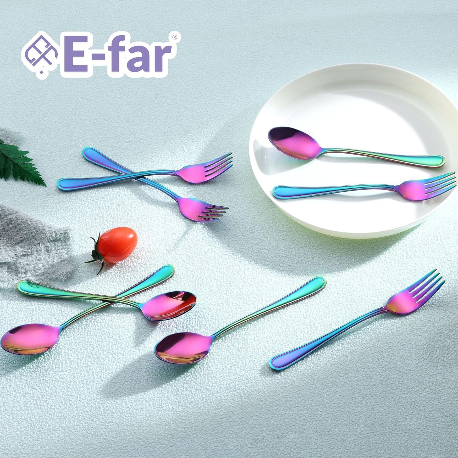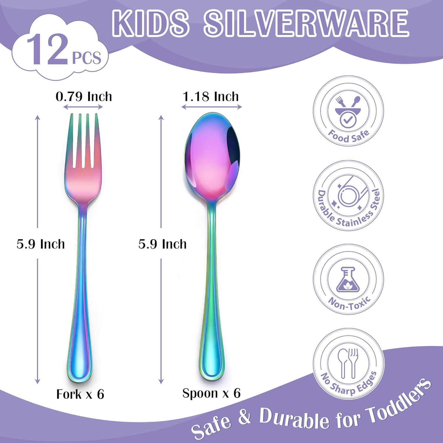E-far 12-Piece Toddler Silverware, Stainless Steel Kids Utensils Forks and Spoons, Children Safe Metal Cutlery Set for Self Feeding, Mirror Polished & Dishwasher Safe, 6 Forks & 6 Spoons(Rainbow)