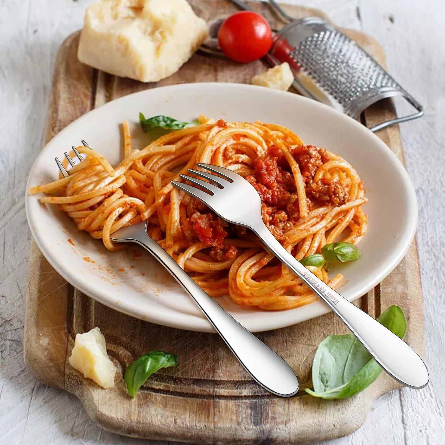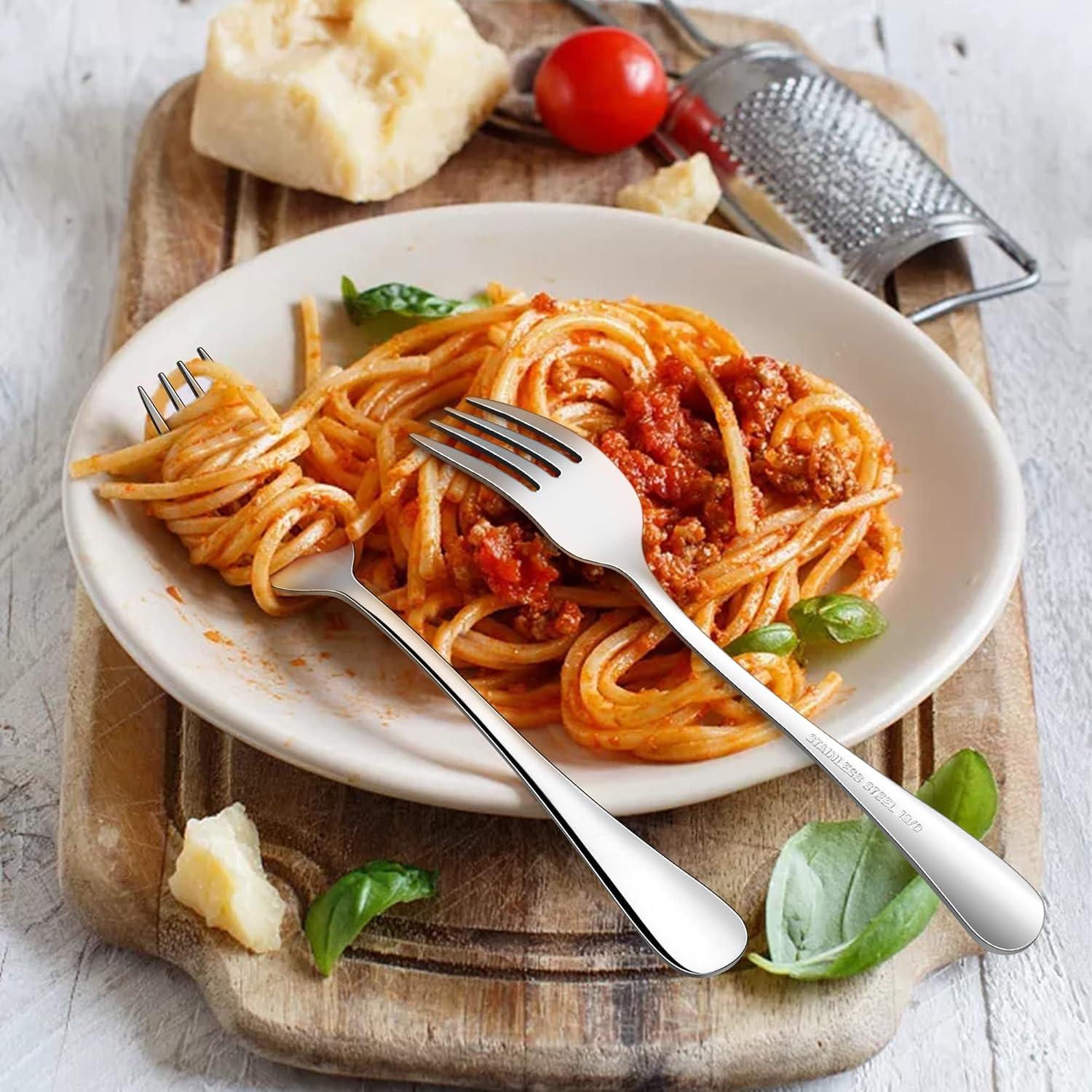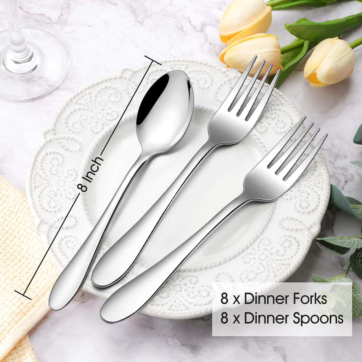The silver dinner forks and spoons set have ergonomically-designed and round handle, provide a suitable grip, make it feel good in hands, Appropriate weight and suitable size, ensure well balance, Make you to hold and grip the product comfortably