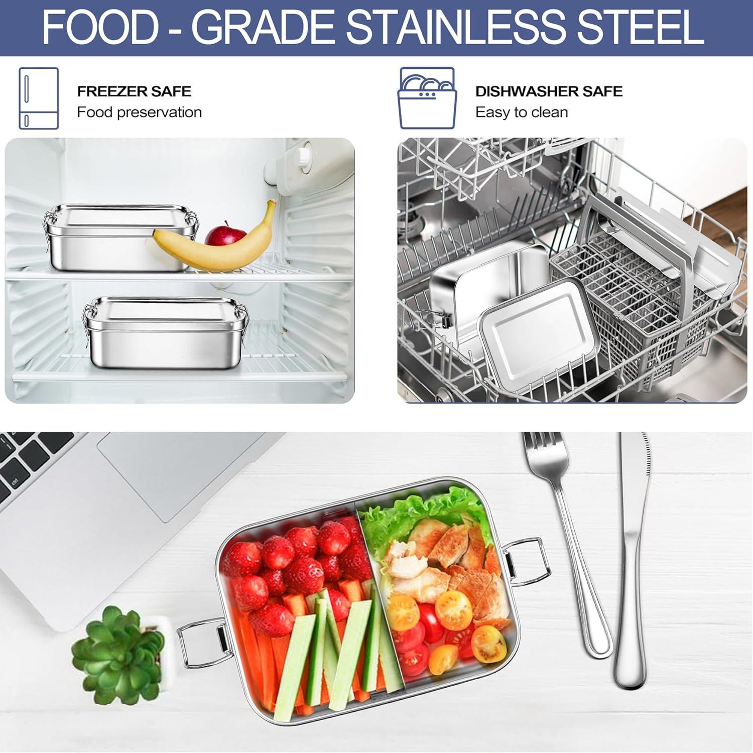 ECO-FRIENDLY & DURABLE: Stainless steel bento box is reusable to help you reduce the use of disposable food containers and can also be used as storage containers for food; Freezer safe and dishwasher safe (Tip: Cannot be used in microwaves; Remove the lid before placing box in the dishwasher for better maintenance)