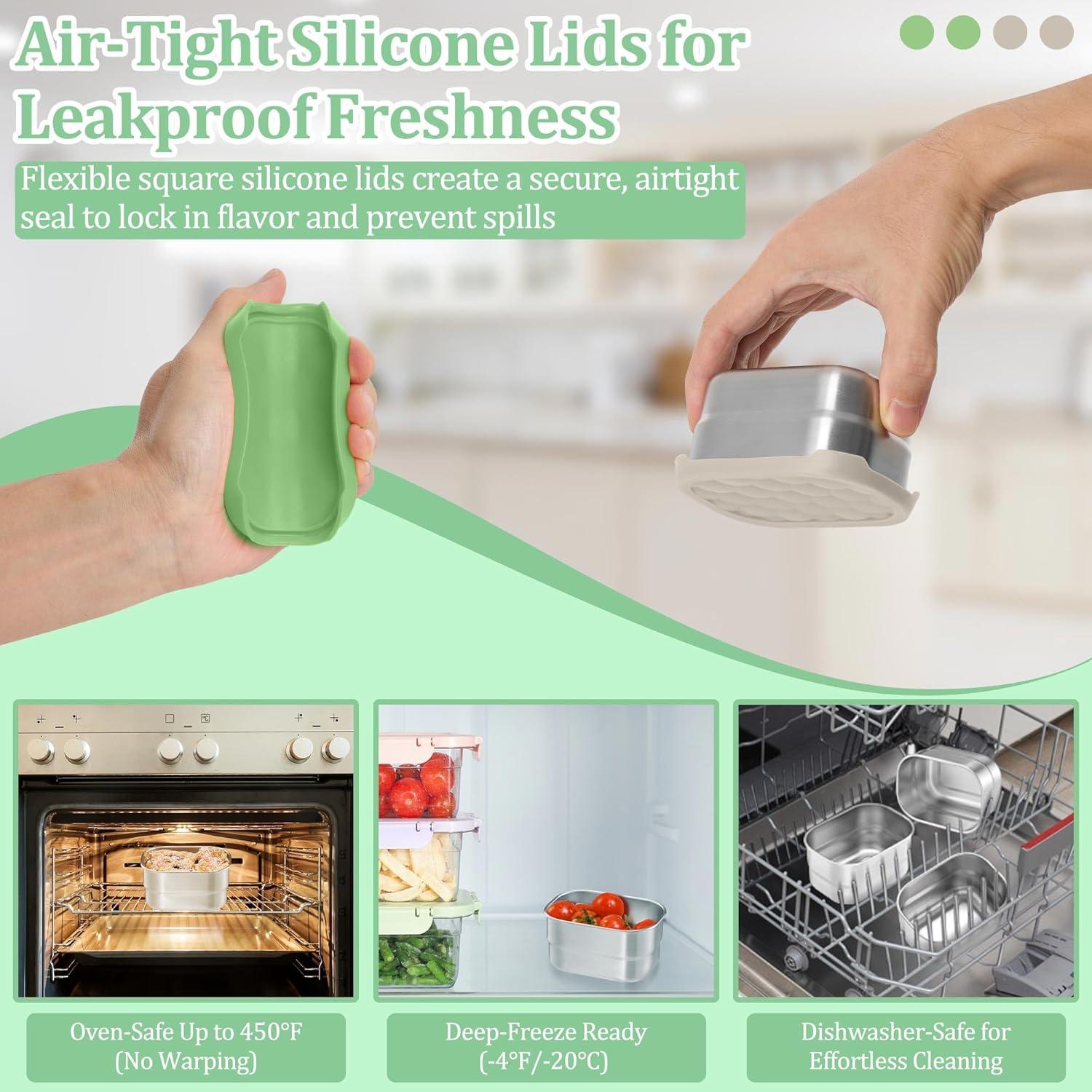 EASY TO CLEAN & OVEN SAFE: Dishwasher-safe stainless steel body and stain-resistant silicone lids simplify cleanup, Stackable design saves kitchen space, Oven-safe containers (lid excluded) and freezer-safe durability support various meal prep needs