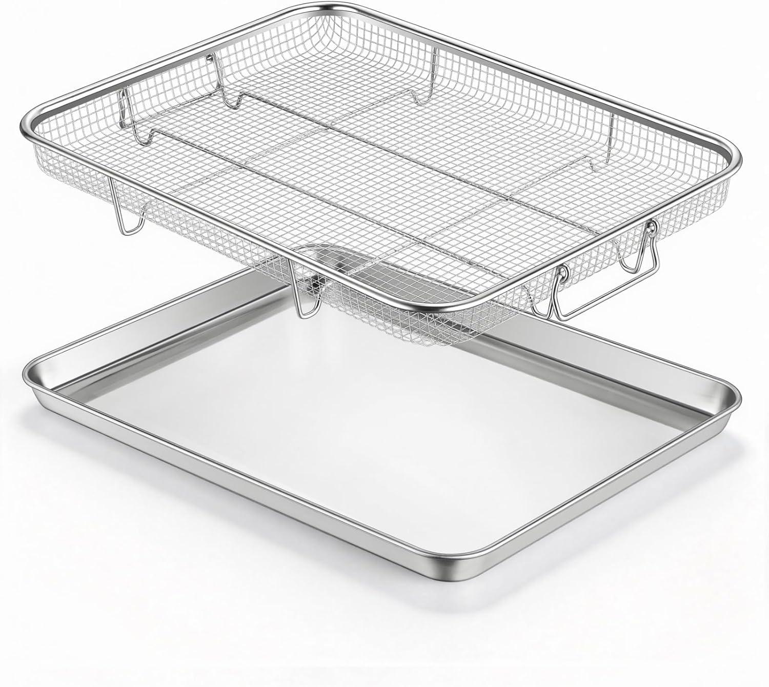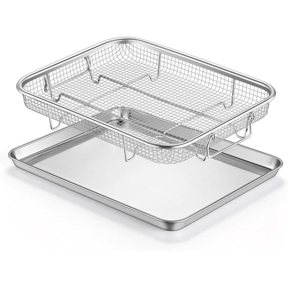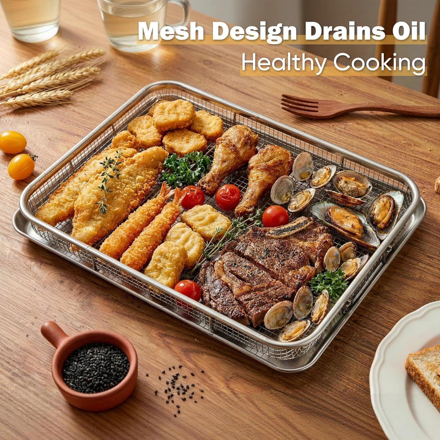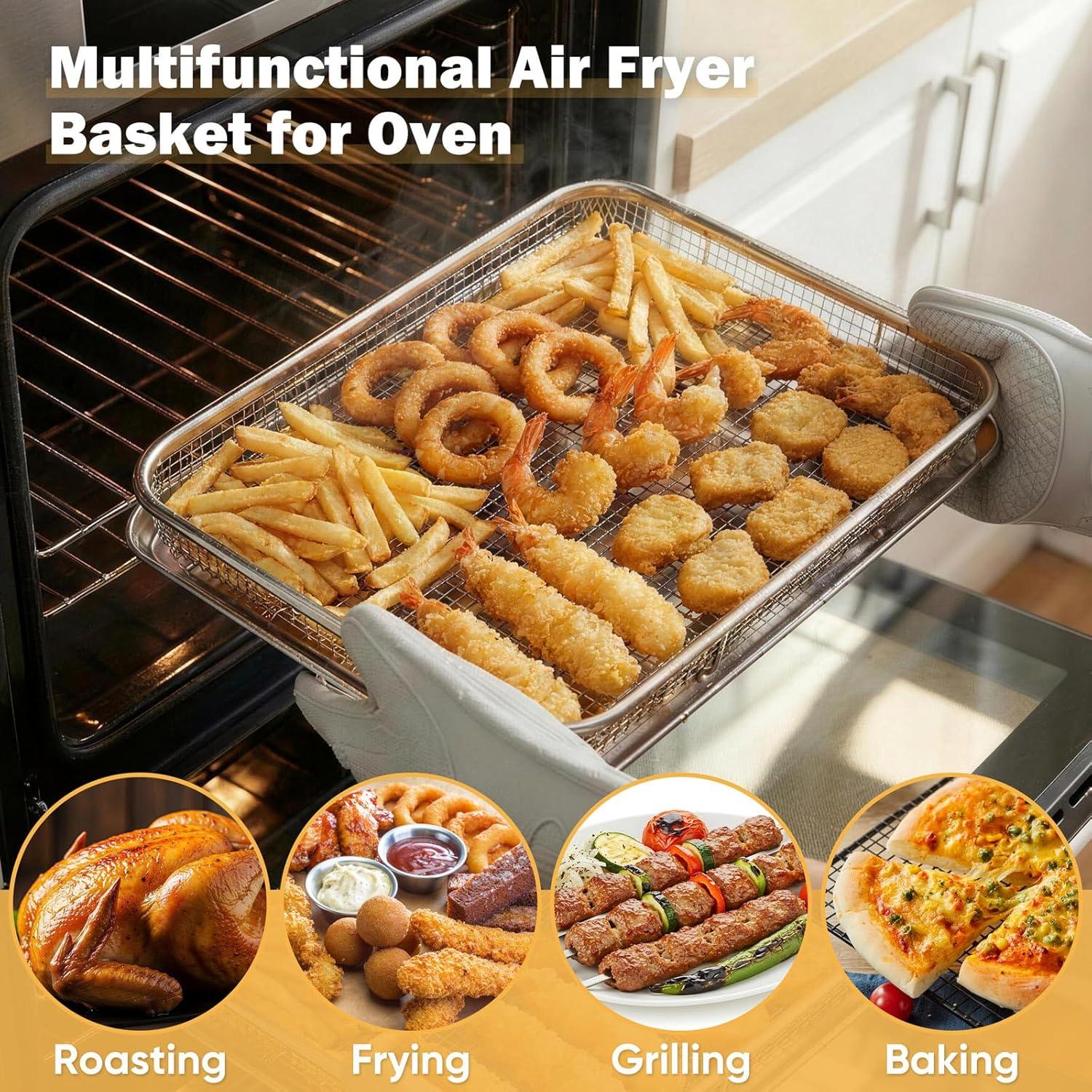 【Multi-Purpose Oven Accessory for All Needs】Beyond crispy cooking, the set is ideal for baking, roasting, broiling and grilling for daily meals, family gatherings and casual snacks; Use the mesh basket for crispy bacon, shrimp, fries, chicken wings and veggie sticks, and the tray for casseroles, cookies, pizza, baked veggies and quiches—an all-in-one set that replaces multiple bakeware pieces