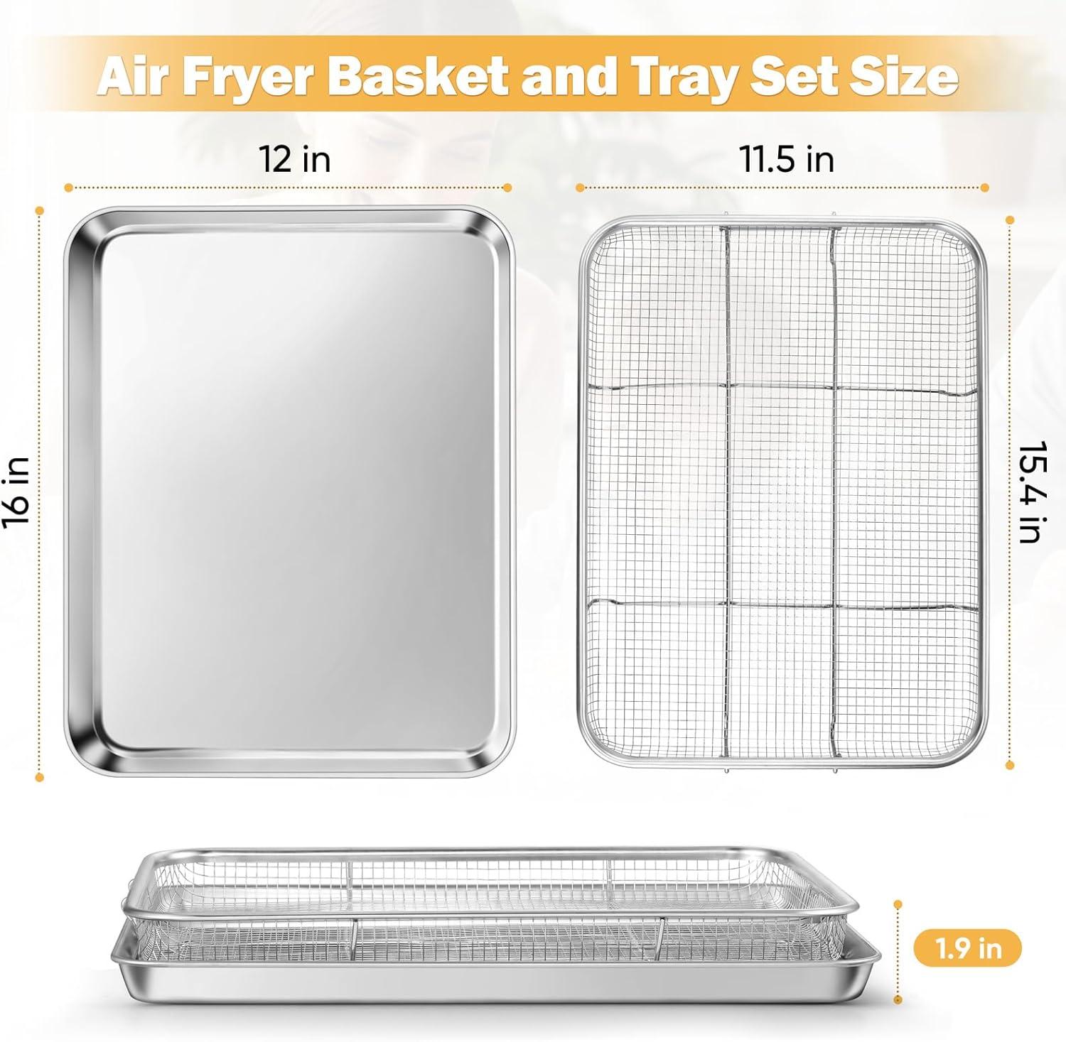 【2-Piece Value Set with Perfect Sizing】 Package includes 1 stainless steel air fryer basket (15.4’’ x 11.5’’) and 1 matching drip tray (16’’ x 12’’), ideal for most household convection ovens; The set works together for crispy cooking or separately for baking/roasting, perfect for family meals or guest gatherings