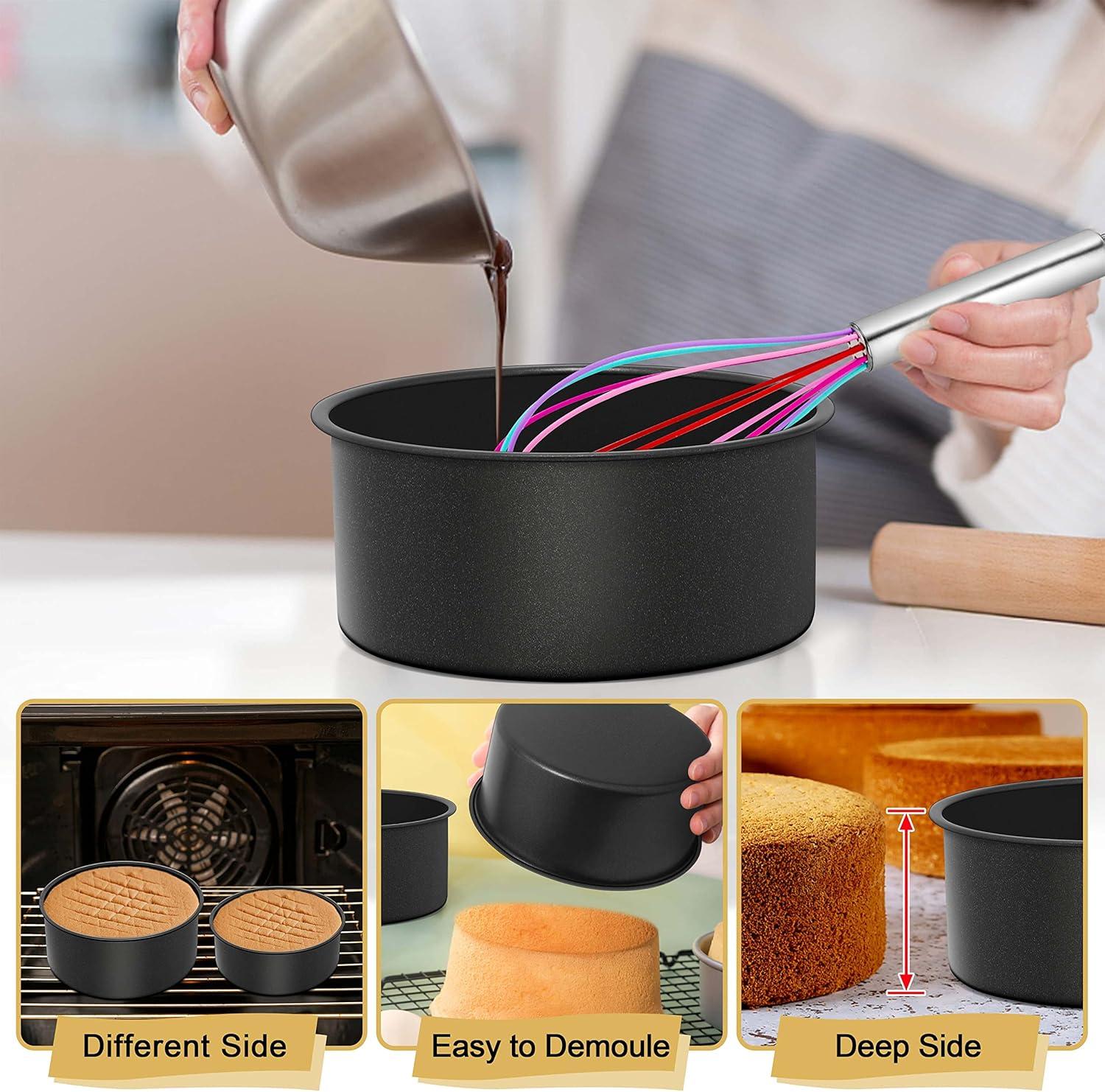 【3 DIFFERENT SIZES WITH DEEP SIDE】3-Piece cake pans measures 4 x 2, 6 x 3 and 8 x 3 inches, Difference in size can meet toaster oven/air fryer/instant pot different demands, 3 Inch deep side provide taller and larger capacity, Allow cake to grow much higher and no worry of overflow