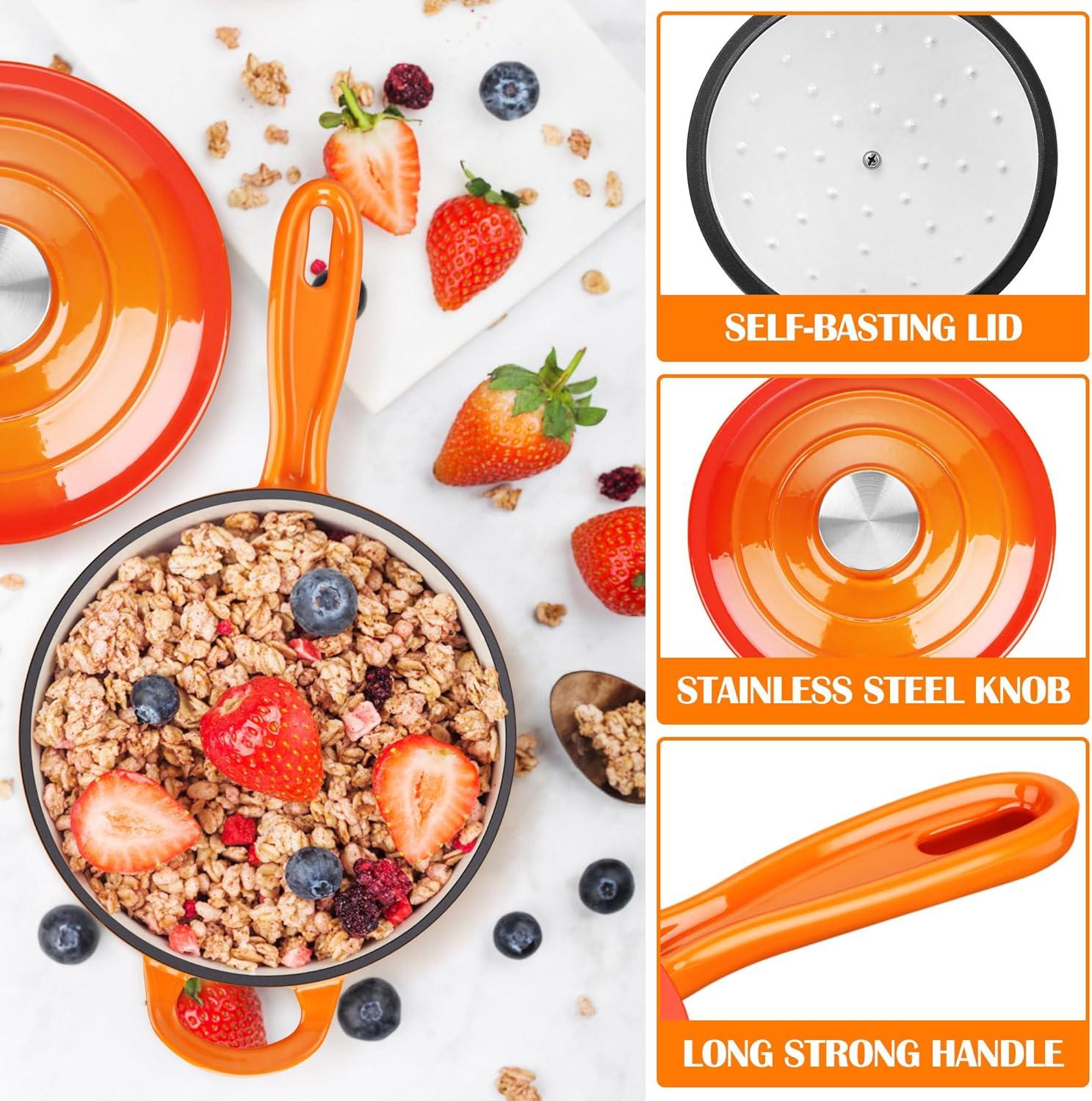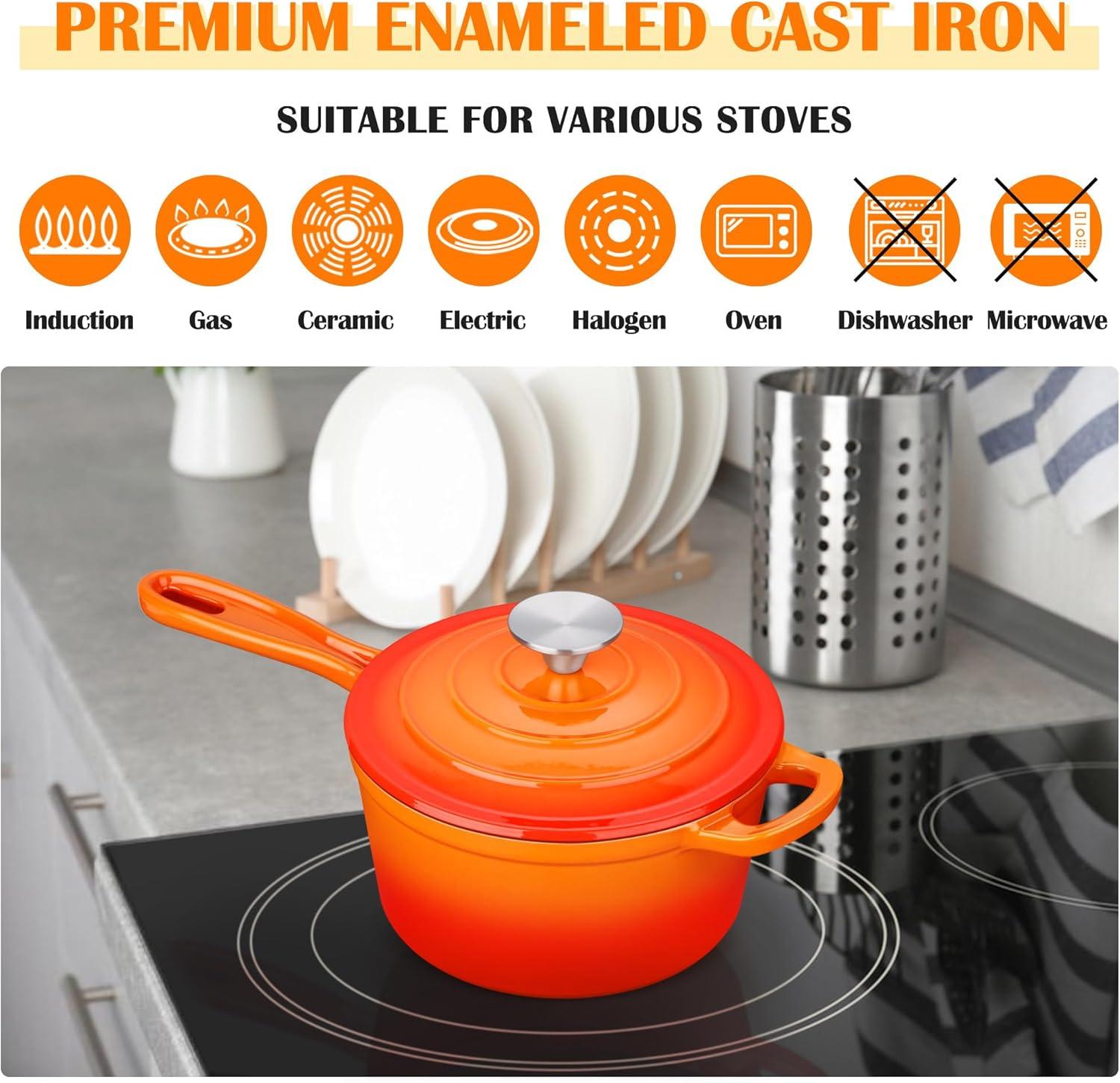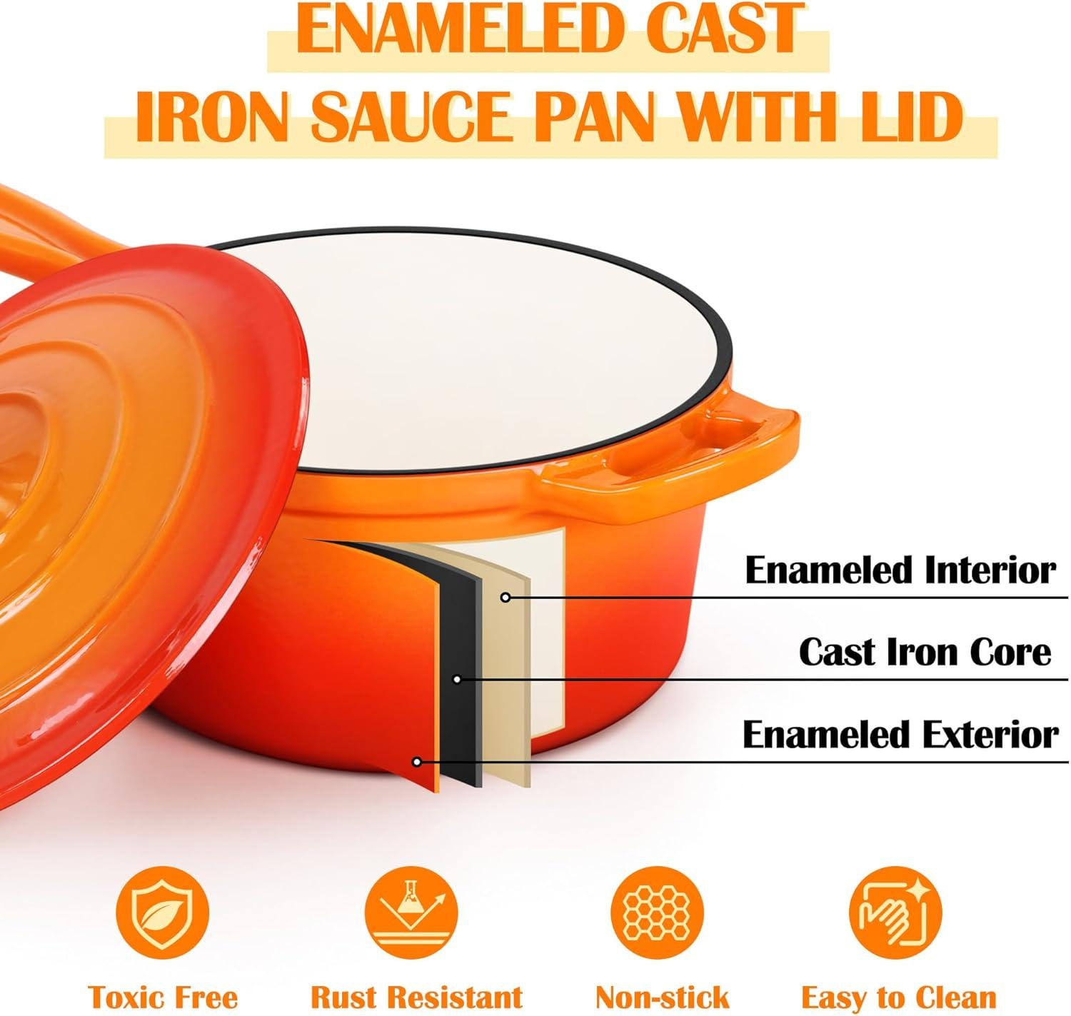 E-far Enameled Cast Iron Sauce Pan, 2 Quart Dutch Oven Saucepan with Lid, Small Sauce Pot for Cooking, Boiling, Healthy & Non Toxic, Induction & Oven Safe, Light Blue(Orange)