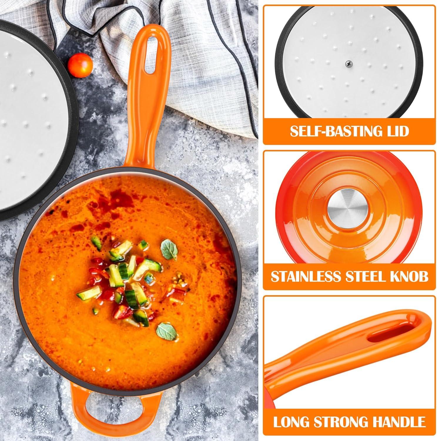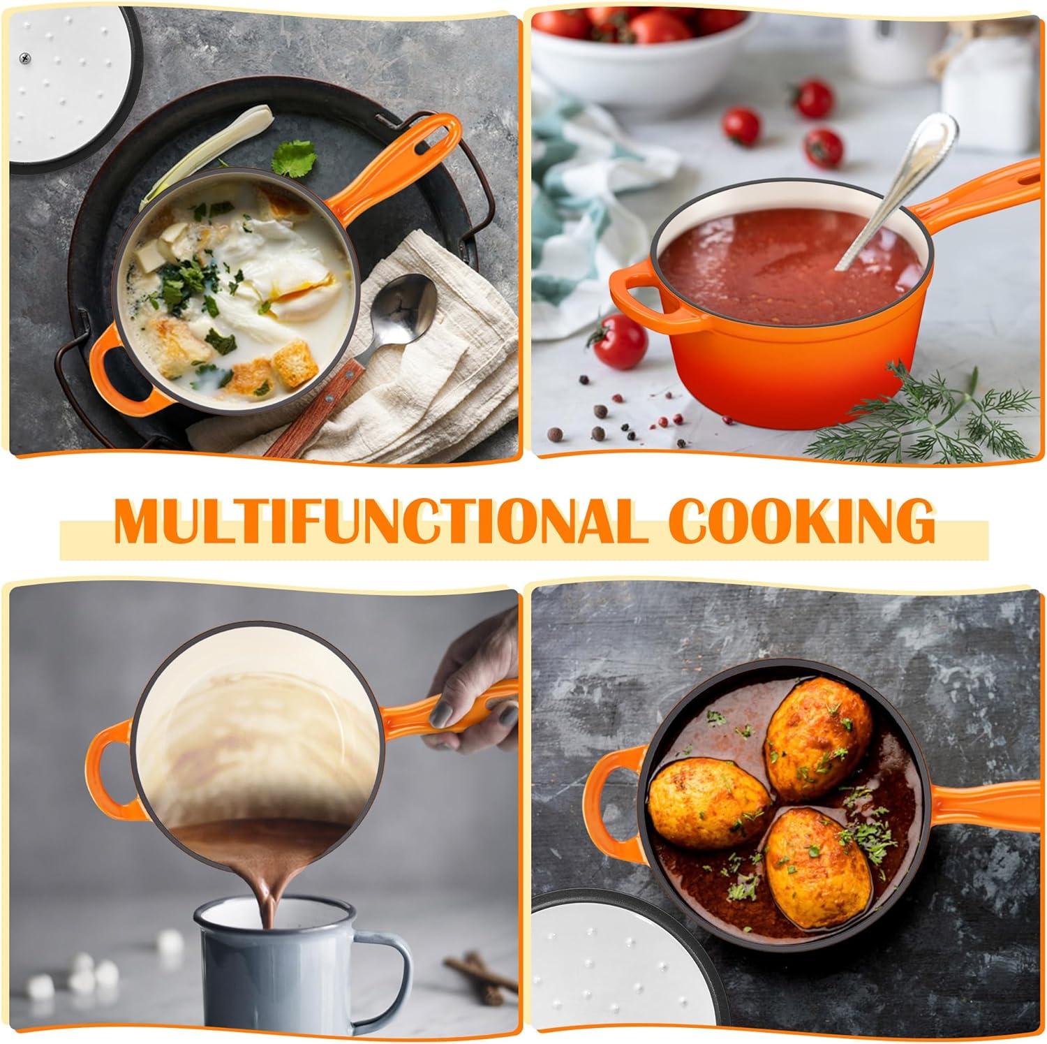 GOOD HEAT CONDUCTION & RETENTION: Cast iron sauce pan has good thermal conductivity and evenly distributed heat in the pot; Cover the tightly lid to circulate the water steam in the pot to prevent water loss and keep the original flavor of the food; Also has good thermal insulation performance, Enjoy the efficient cooking process without wasting time and energy