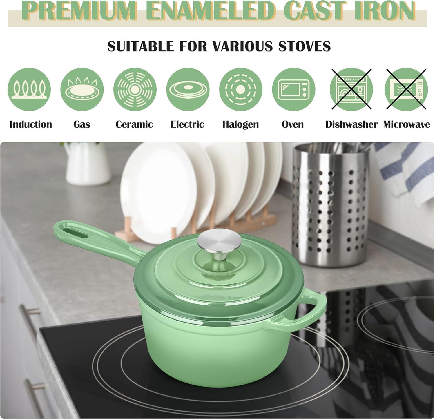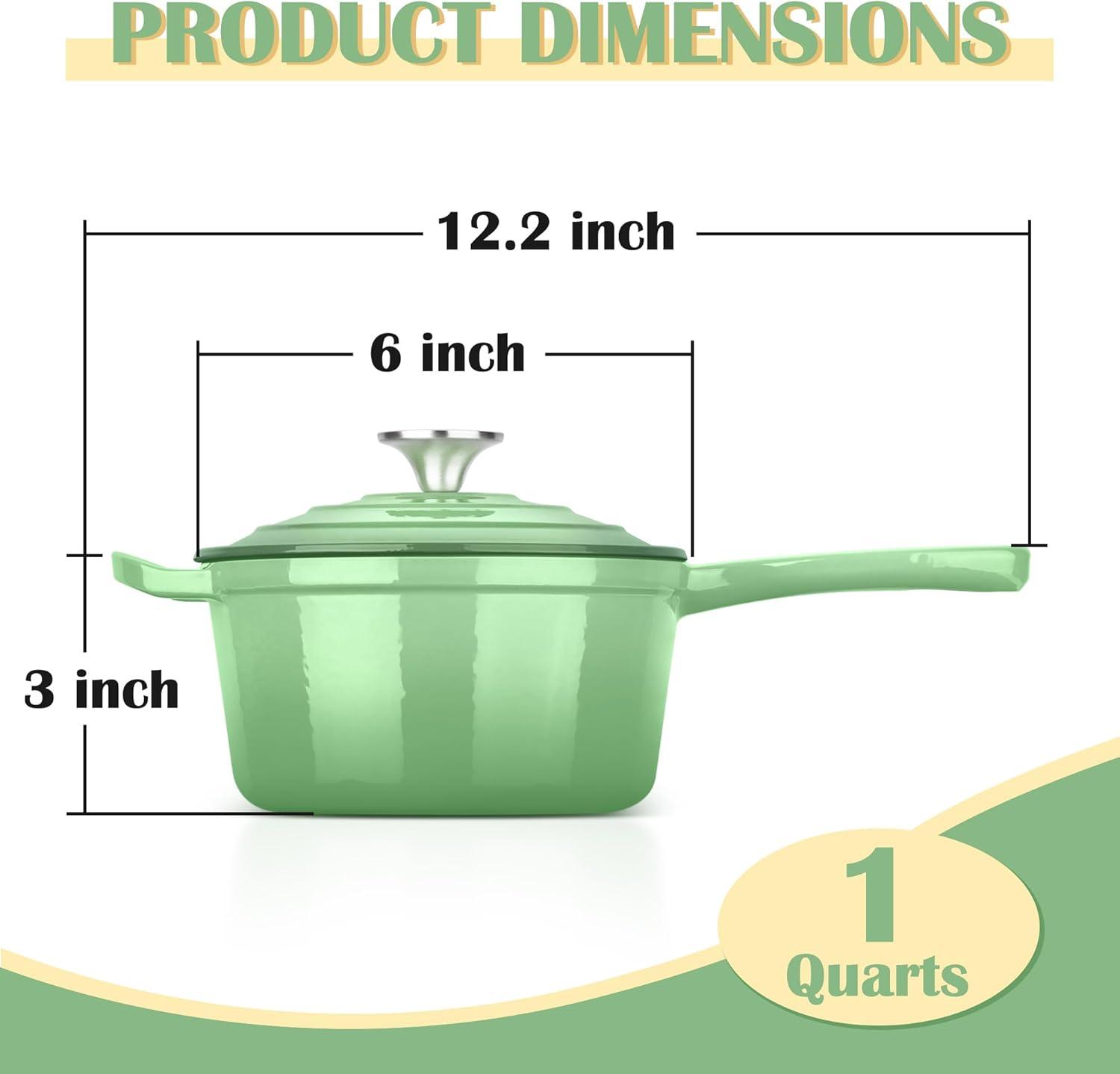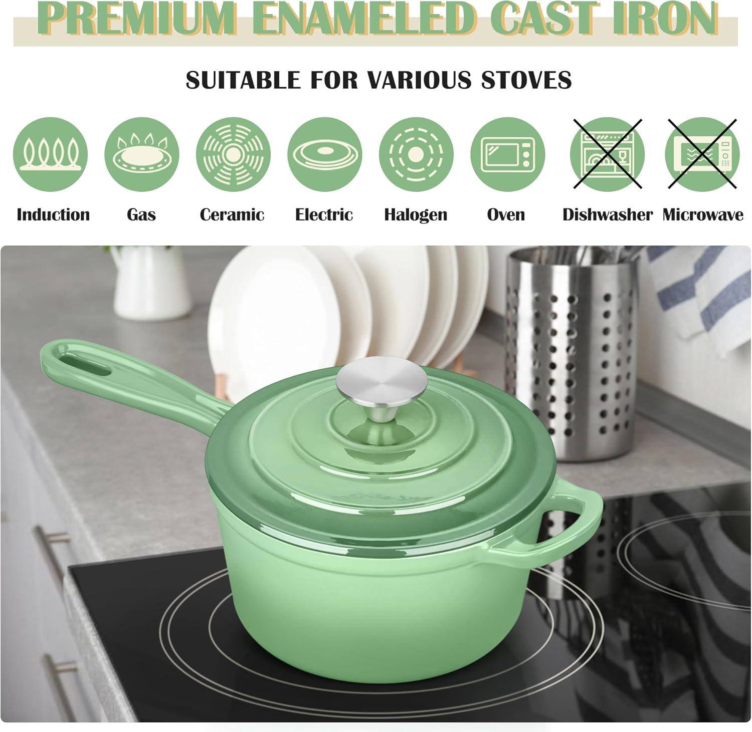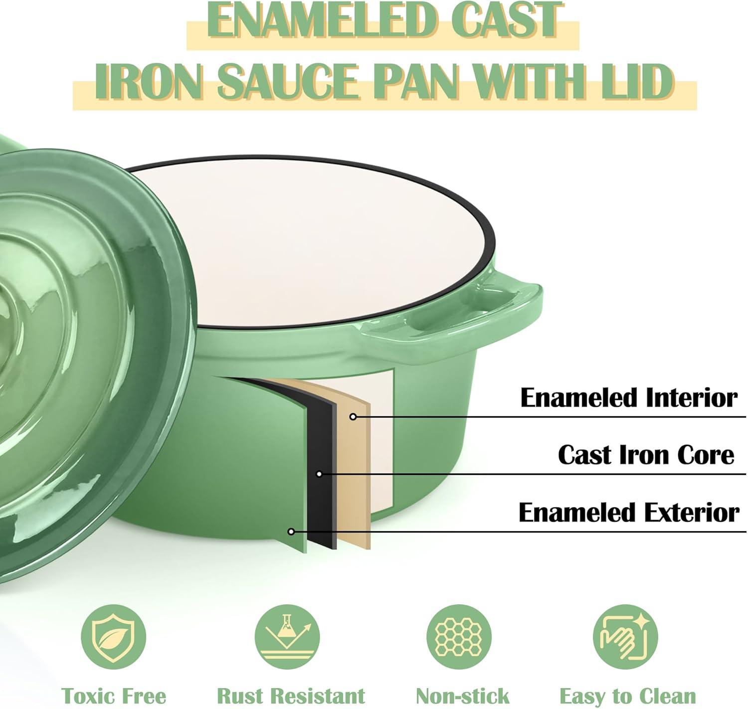 E-far Enameled Cast Iron Sauce Pan, 2 Quart Dutch Oven Saucepan with Lid, Small Sauce Pot for Cooking, Boiling, Healthy & Non Toxic, Induction & Oven Safe, Light Blue(Pistachio Green)