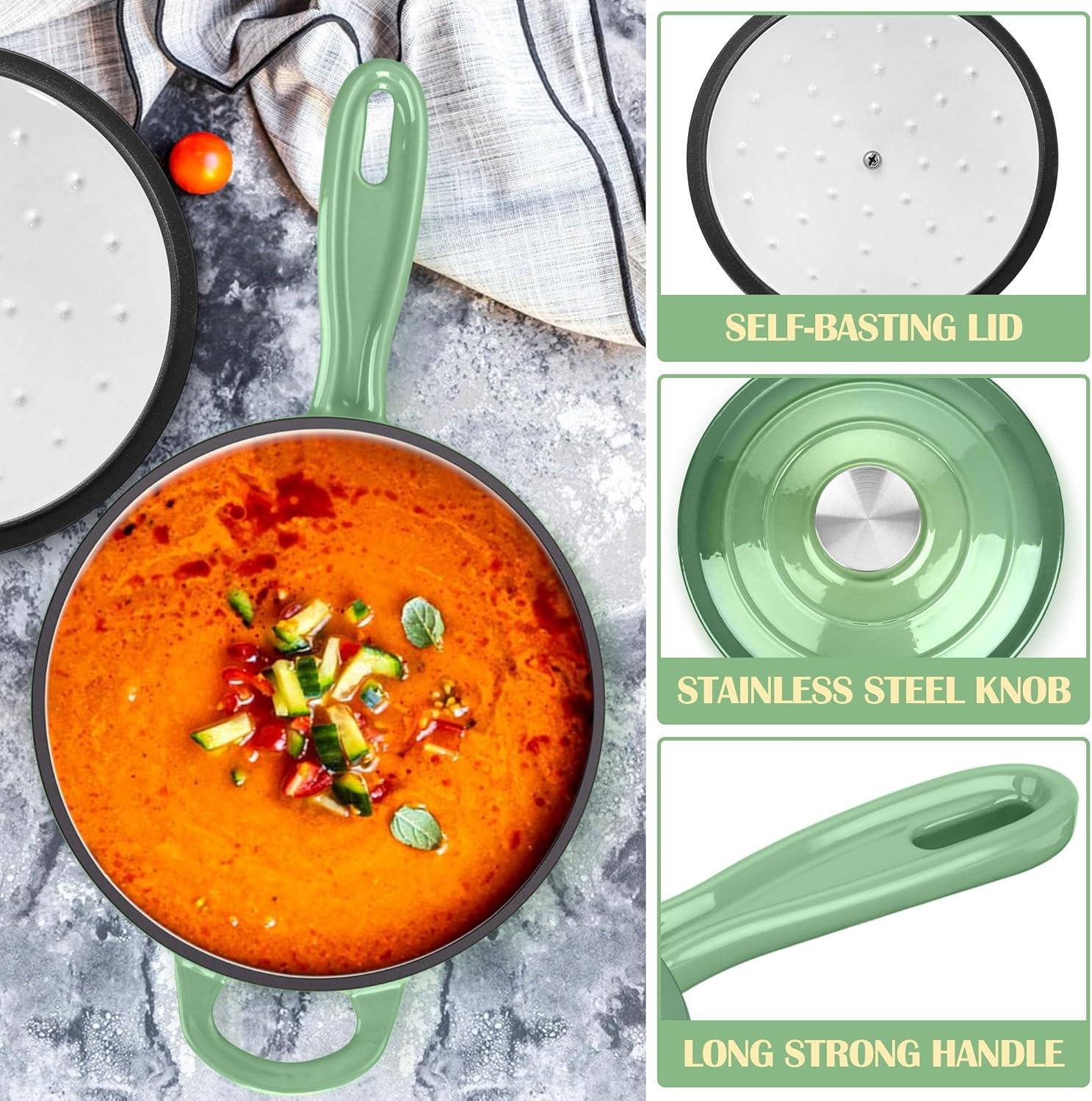 GOOD HEAT CONDUCTION & RETENTION: Cast iron sauce pan has good thermal conductivity and evenly distributed heat in the pot; Cover the tightly lid to circulate the water steam in the pot to prevent water loss and keep the original flavor of the food; Also has good thermal insulation performance, Enjoy the efficient cooking process without wasting time and energy
