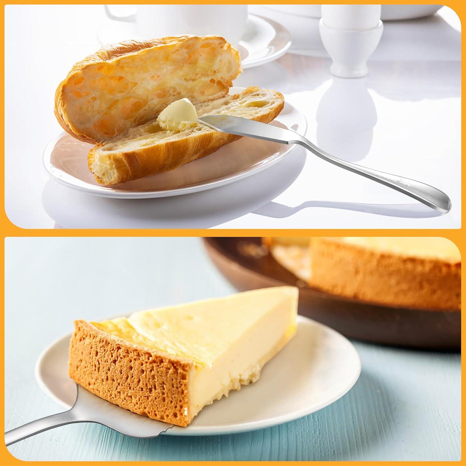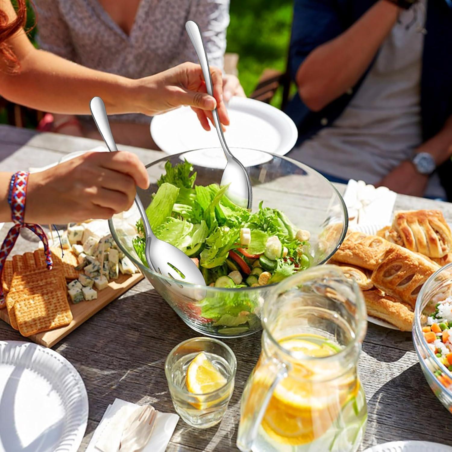 10 PIECES LARGE SERVING SET: The serving utensils set includes all basic pieces needed for serving food, 2 serving spoons(9.8”), 2 serving forks(9.9”), 2 slotted spoons(9.8”), 2 serving tongs(9.5”), 1 cake server(9”), 1 Butter Knife(5.9”), Suitable for various cuisines and can be used for parties, buffet, barbecue, wedding and festivals