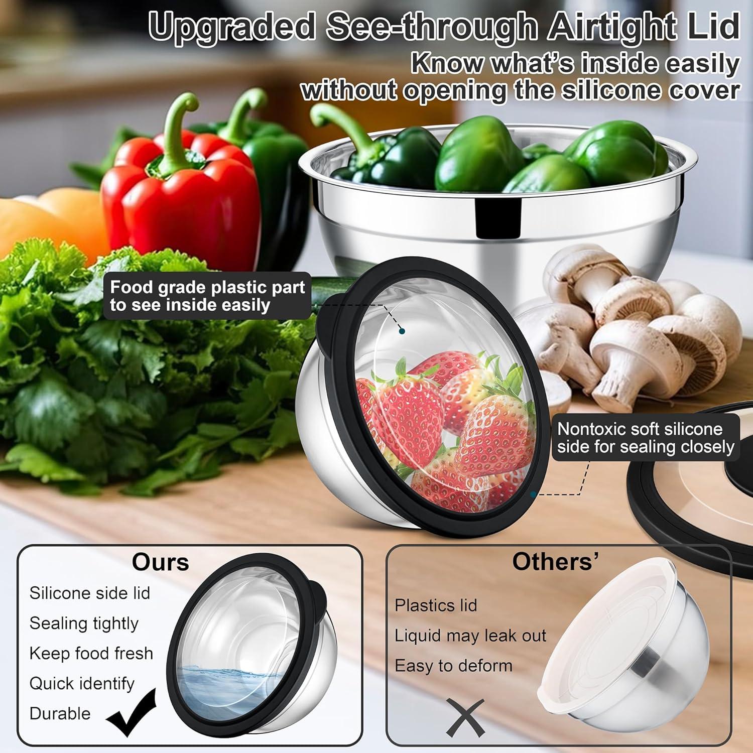 UPGRADED AIRTIGHT CLEAR LIDS: The bowl's cover is compose of transparent plastic middle part and silicone edge, This design helps to quickly identify the food inside without opening the lid, Silicone side can seal tightly, No more worry of spilling and leaking, Make sure that less dust enters the bowl and lock the freshness, Suit for storing leftovers in the refrigerator, Take them as containers for serving food, The roll-rimmed edge and lid help to easily carry food for camping or picnics, Convenience to your daily life