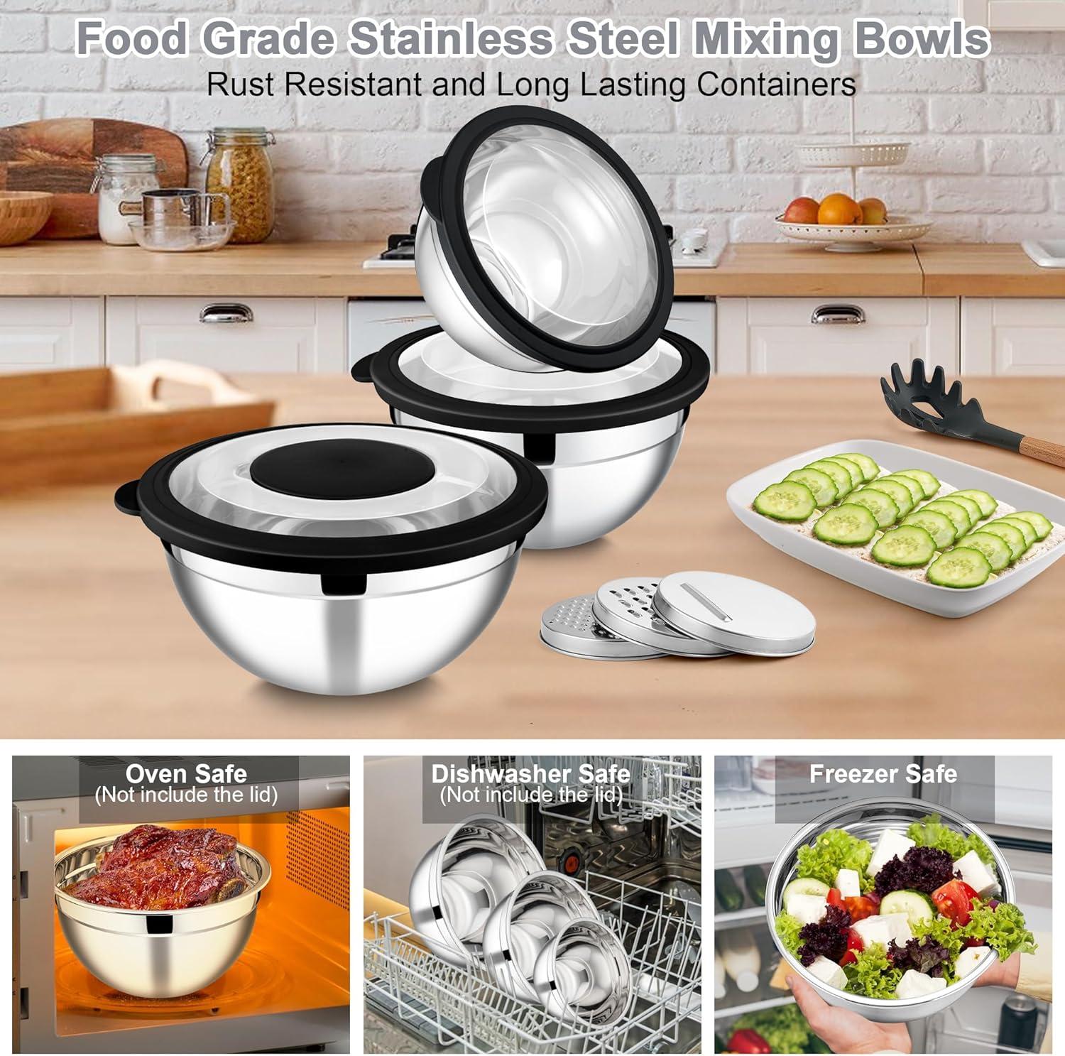 HIGH QUALITY METAL MATERIAL: Our mixing salad bowls are made of premium stainless steel for anti-rust and corrosion proof, Oven safe (Exclude the covers) solid structure is shatterproof and not easy to deform, dent and break as the glass/plastic bowls, All mixing bowls without any chemical coating, Features a mirror-polished interior and a matte-polished exterior, Perform better scratch resistance and less water spot left for easy cleaning, Sturdy and healthy steel bowls for years to come