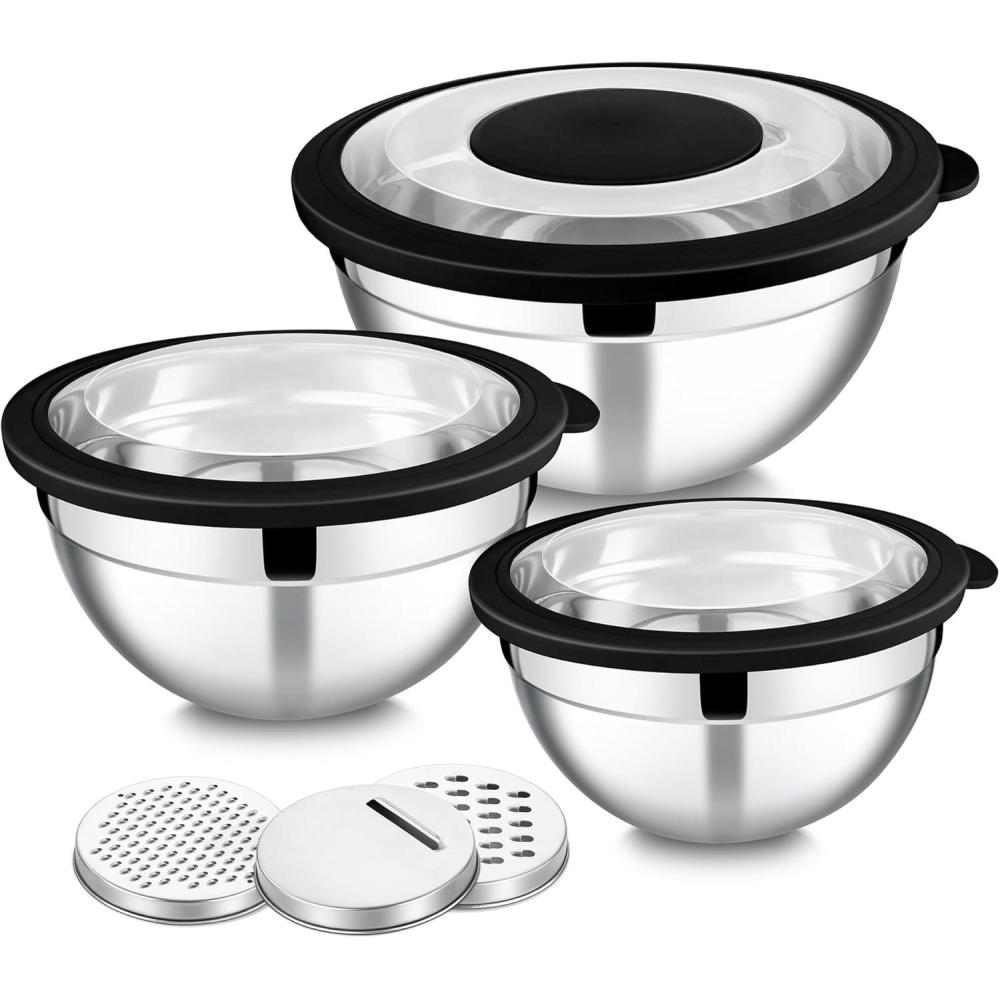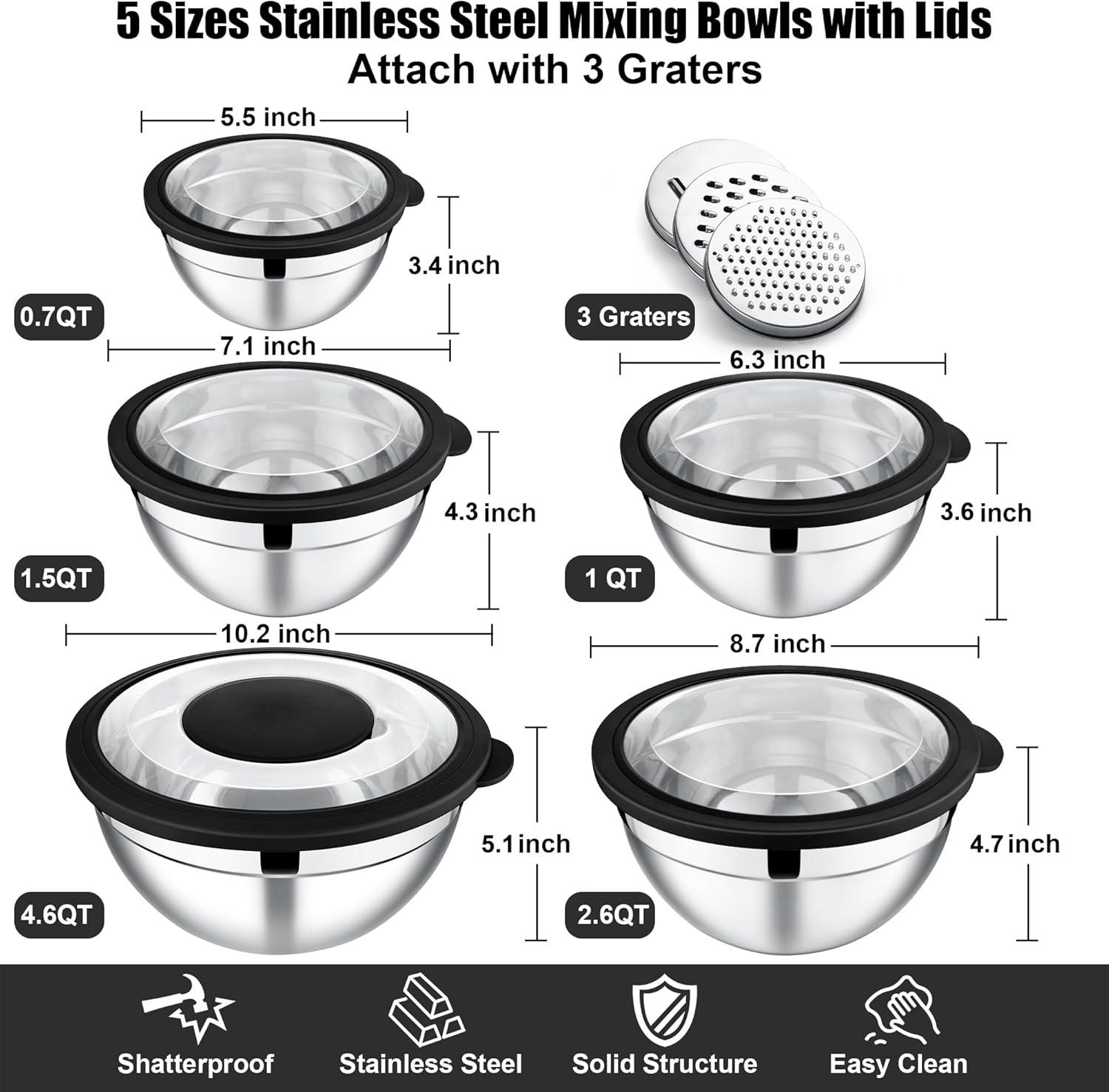 MULTIPURPOSE MIXING BOWLS: This food storage container set include 5 metal kitchen bowls (4.6/2.6/1.5/1/0.7 Quart), 5 see-through lids and 3 grater kitchen tools, Various sizes can meet different needs in cooking/meal prepping/serving/baking, Versatile kitchen containers for mixing ingredients/salad/batters, marinating meat, washing vegetables and carrying food for camping/picnic, Ideal gift for housewarming, birthday, wedding, Christmas and any other occasions