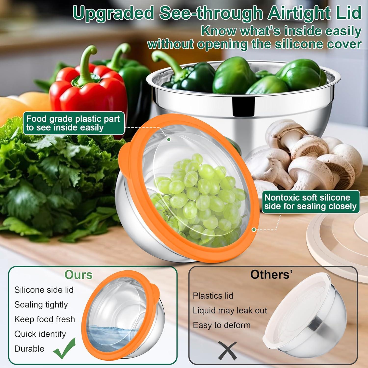 UPGRADED AIRTIGHT CLEAR LIDS: The bowl's cover is compose of transparent plastic middle part and silicone edge, This design helps to quickly identify the food inside without opening the lid, Silicone side can seal tightly, No more worry of spilling and leaking, Make sure that less dust enters the bowl and lock the freshness, Suit for storing leftovers in the refrigerator, Take them as containers for serving food, The roll-rimmed edge and lid help to easily carry food for camping or picnics, Convenience to your daily life