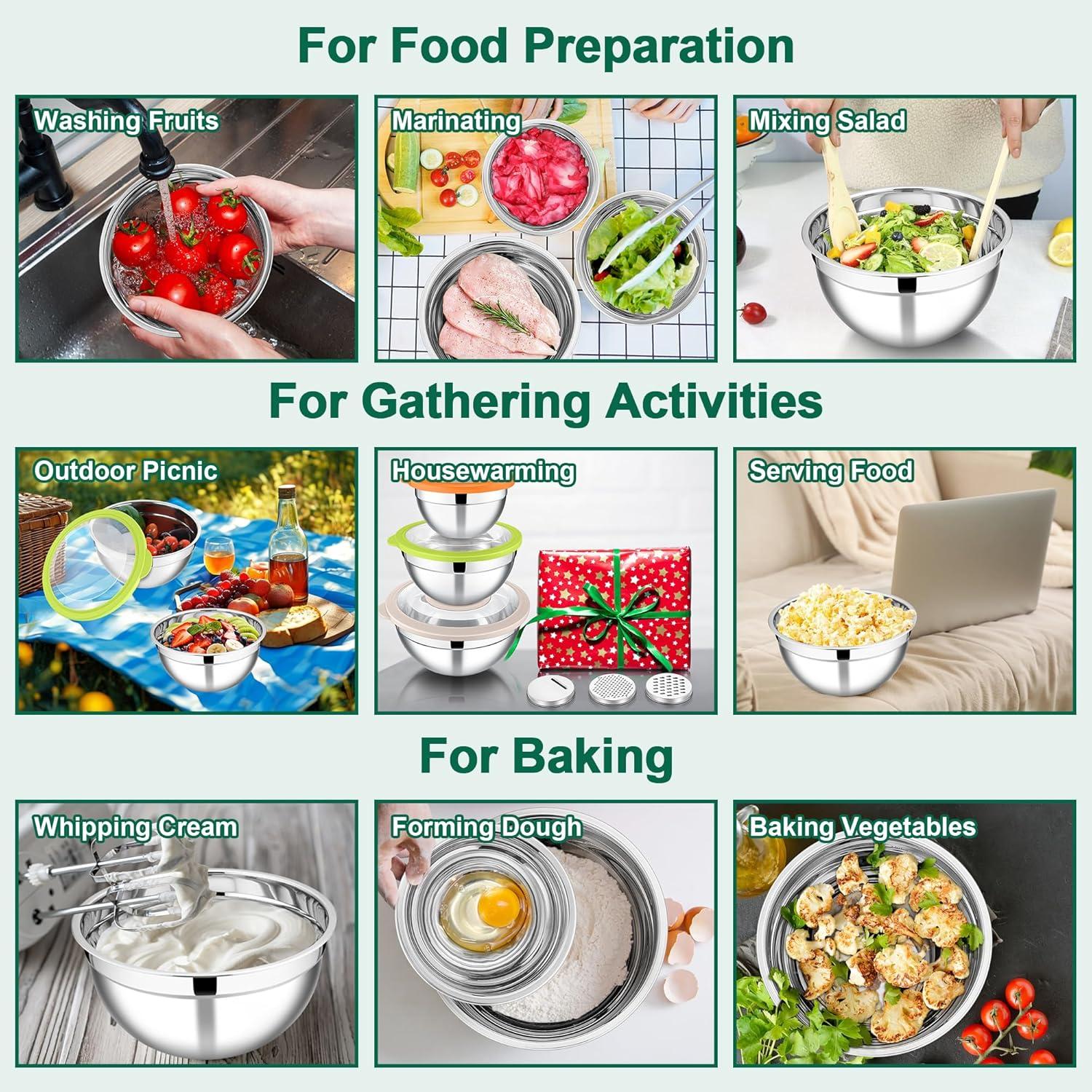 HIGH QUALITY METAL MATERIAL: Our mixing salad bowls are made of premium stainless steel for anti-rust and corrosion proof, Oven safe (Exclude the covers) solid structure is shatterproof and not easy to deform, dent and break as the glass/plastic bowls, All mixing bowls without any chemical coating, Features a mirror-polished interior and a matte-polished exterior, Perform better scratch resistance and less water spot left for easy cleaning, Sturdy and healthy steel bowls for years to come