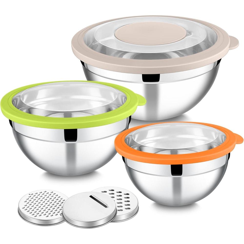 3 DIFFERENT GRATER ATTACHMENTS: Our stainless steel mixing bowls set comes with 3 different grater attachments, They fit right with the largest lid and insert them into the middle part, You can slice/grate/shred cheese and vegetable right into the bowls for a quick salad mixing, Less hassle in cleaning your countertop and kitchenware, Convenient and efficient for mixing salad and cooking for your family
