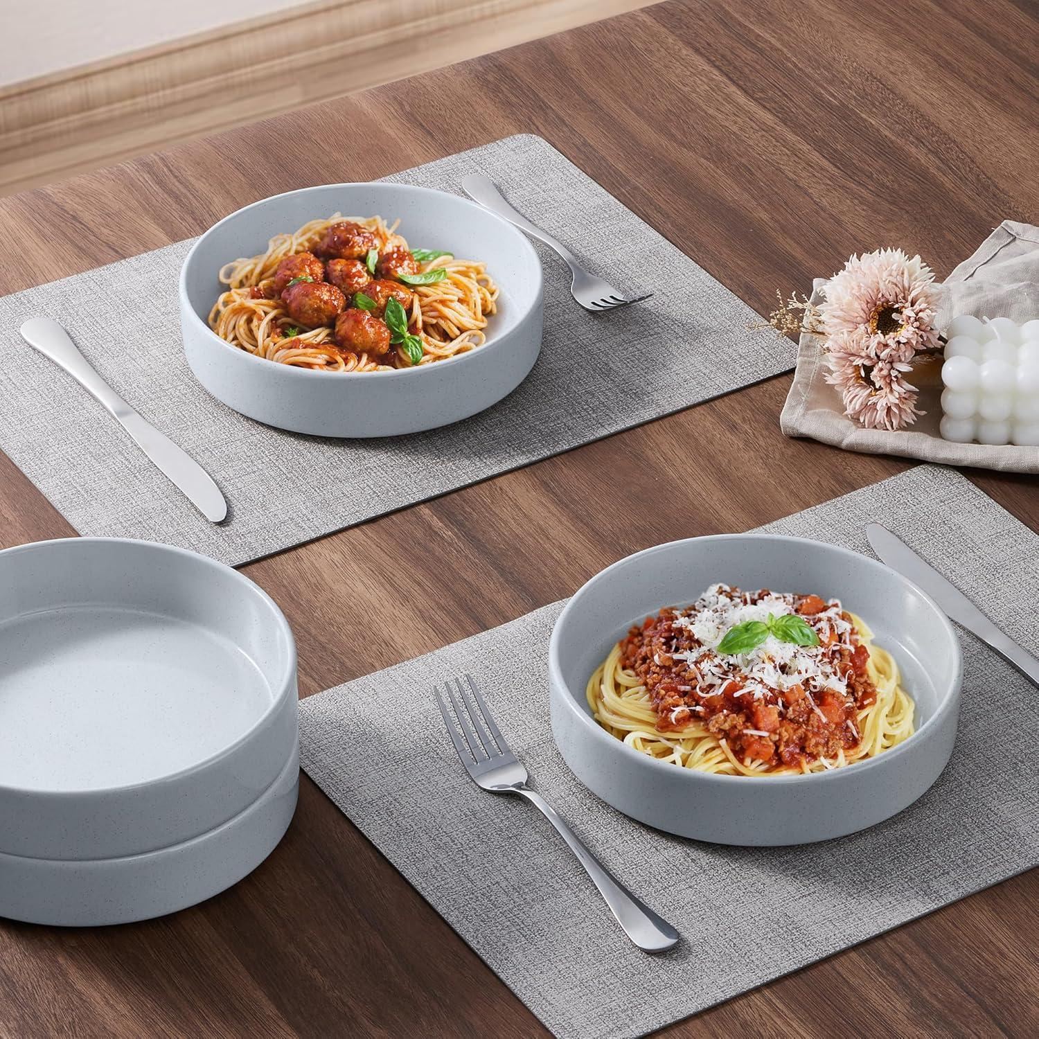 VERSATILE PASTA BOWLS SET OF 4: Each bowl is 1.85″ deep and 8.07″ wide, Holding 35oz, Nice size offers perfect portions of pasta, soups, salads, rice dishes, oatmeal, noodles, stews etc, Or as serving dish or deep dinner plate, Ideal gift for housewarmings, weddings, or special occasions
