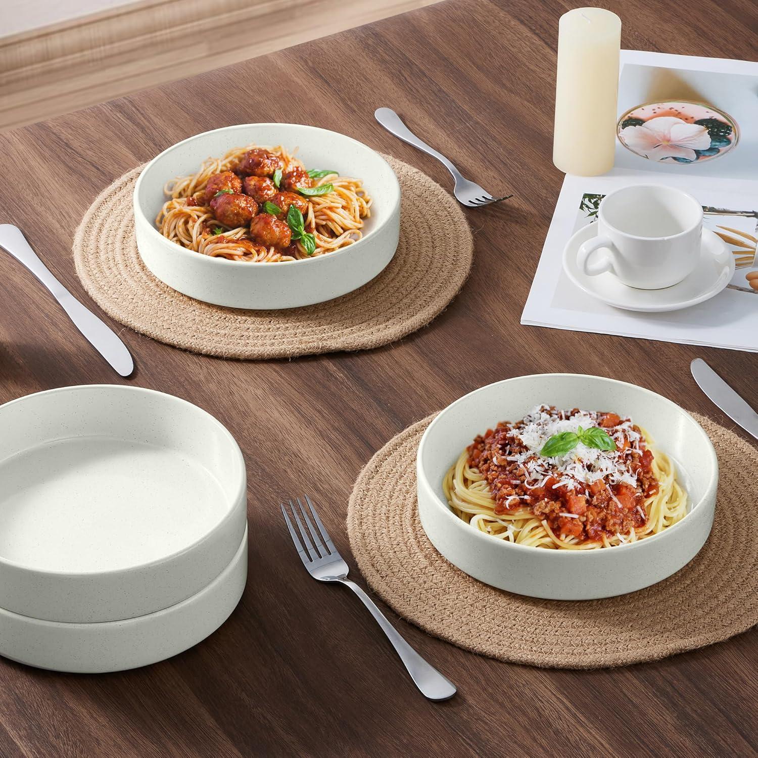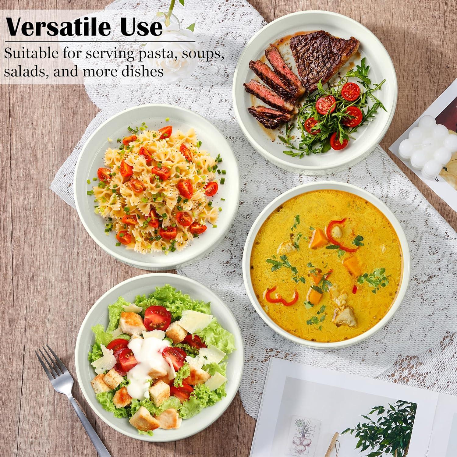 VERSATILE PASTA BOWLS SET OF 4: Each bowl is 1.85″ deep and 8.07″ wide, Holding 35oz, Nice size offers perfect portions of pasta, soups, salads, rice dishes, oatmeal, noodles, stews etc, Or as serving dish or deep dinner plate, Ideal gift for housewarmings, weddings, or special occasions