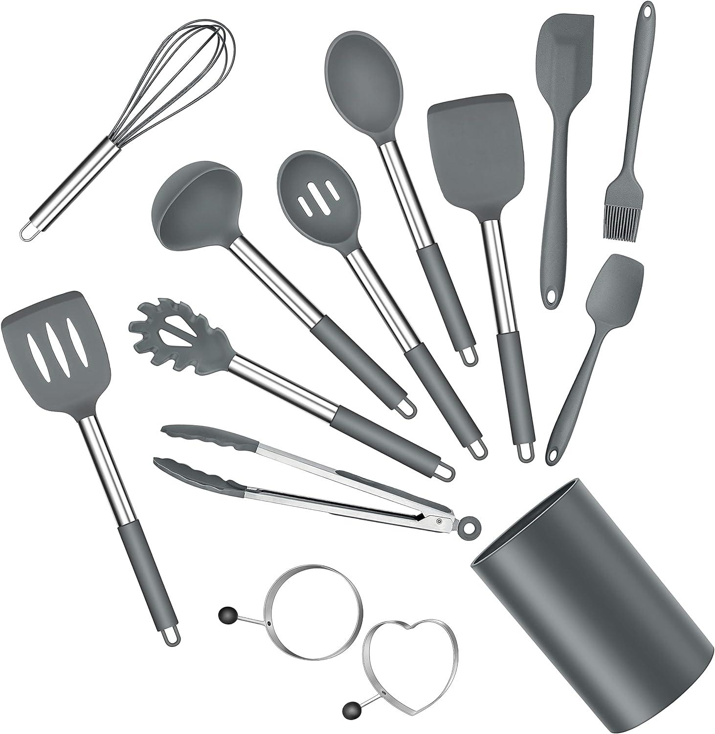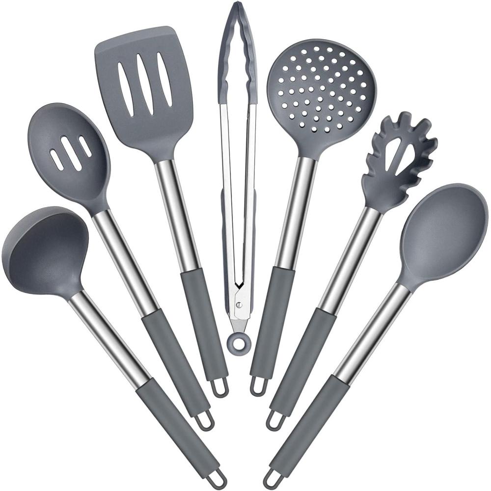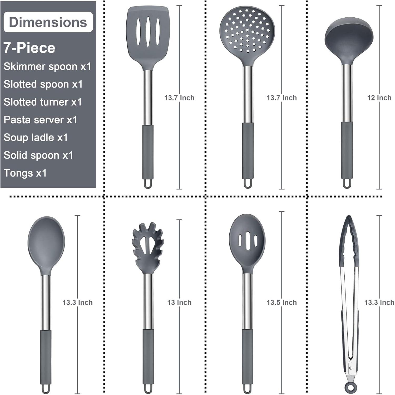 E-far Silicone Cooking Utensils Set, 7 Pcs Heat Resistant Kitchen Utensils with Stainless Steel Handle, Slotted Turner, Spoon, Soup Ladle, Pasta Server, Skimmer, Tongs for Nonstick Cookware, Gray(Gray)