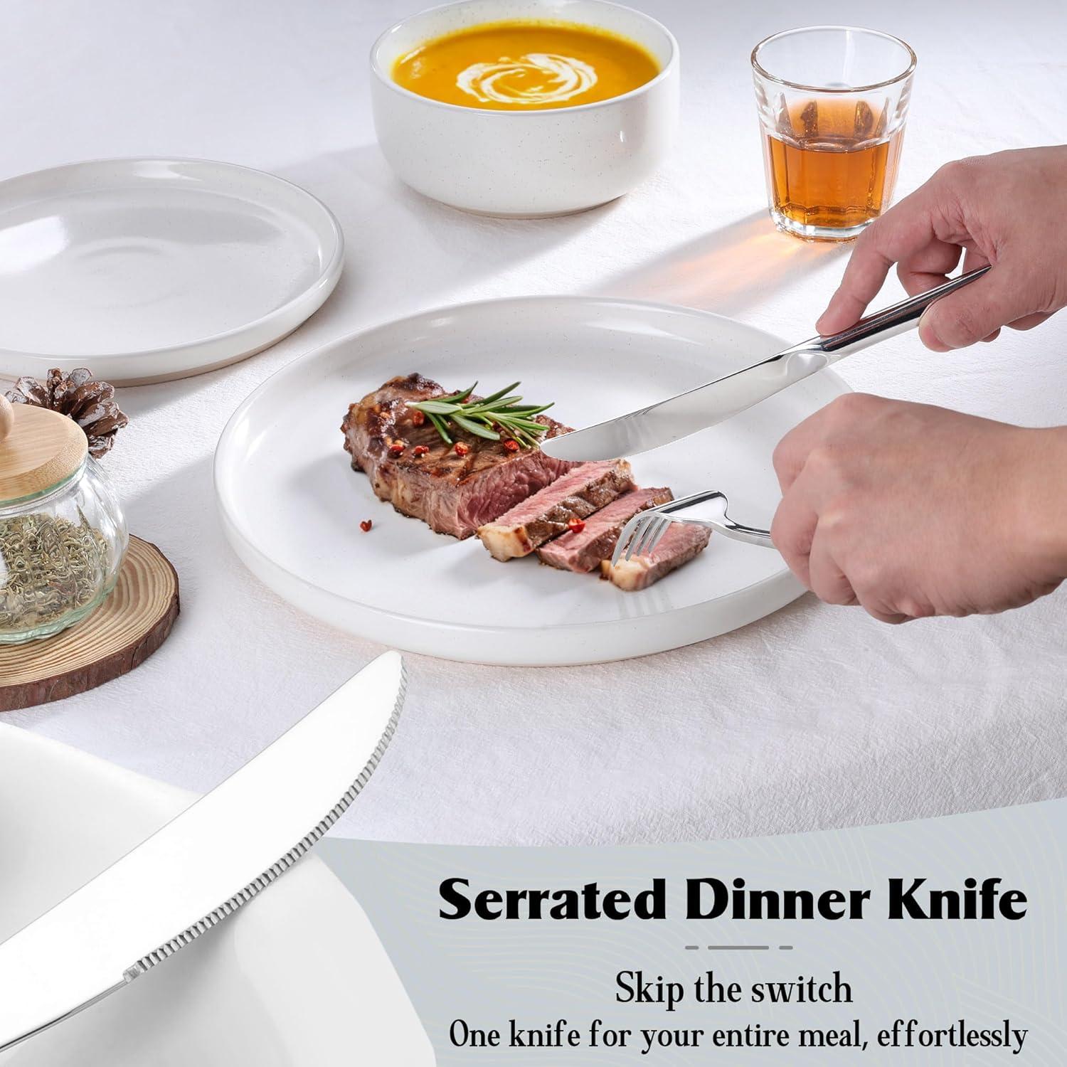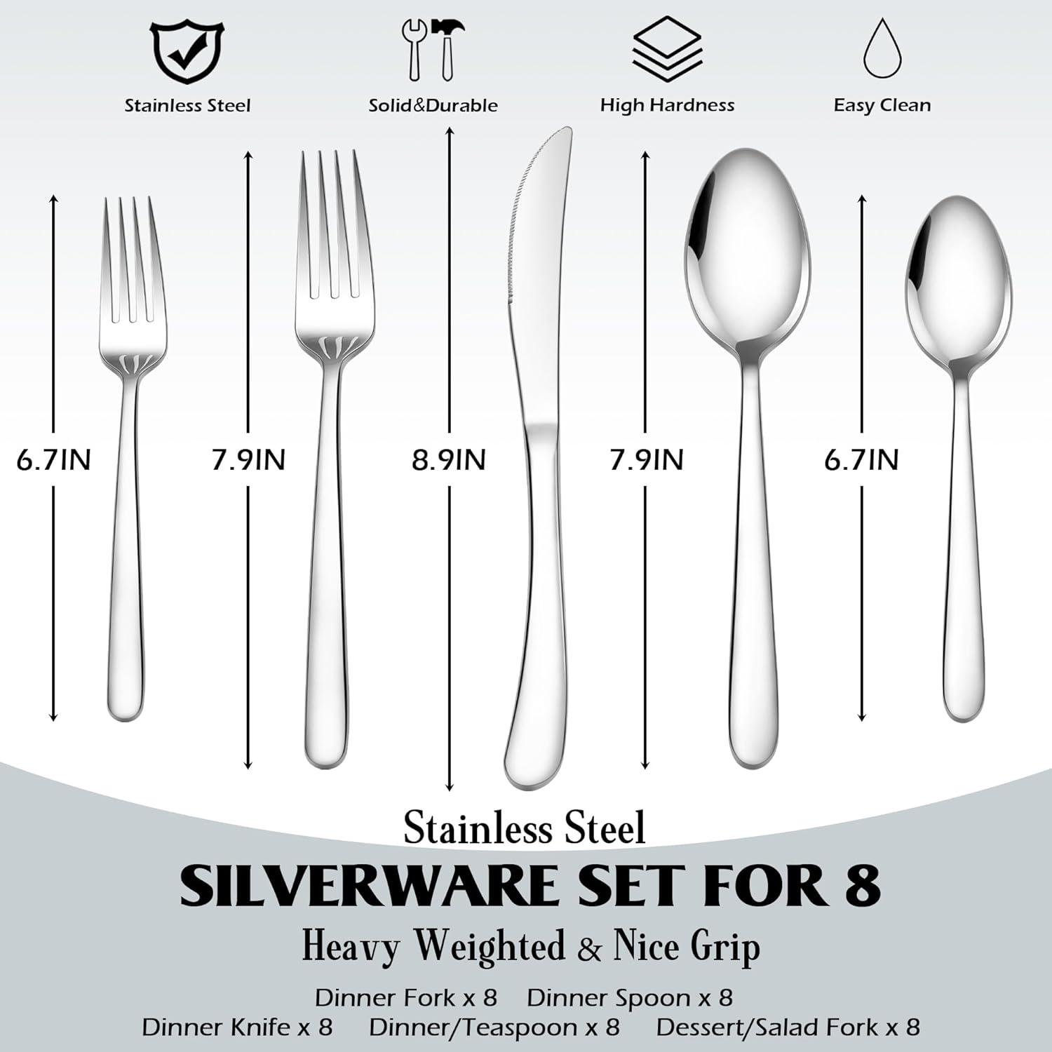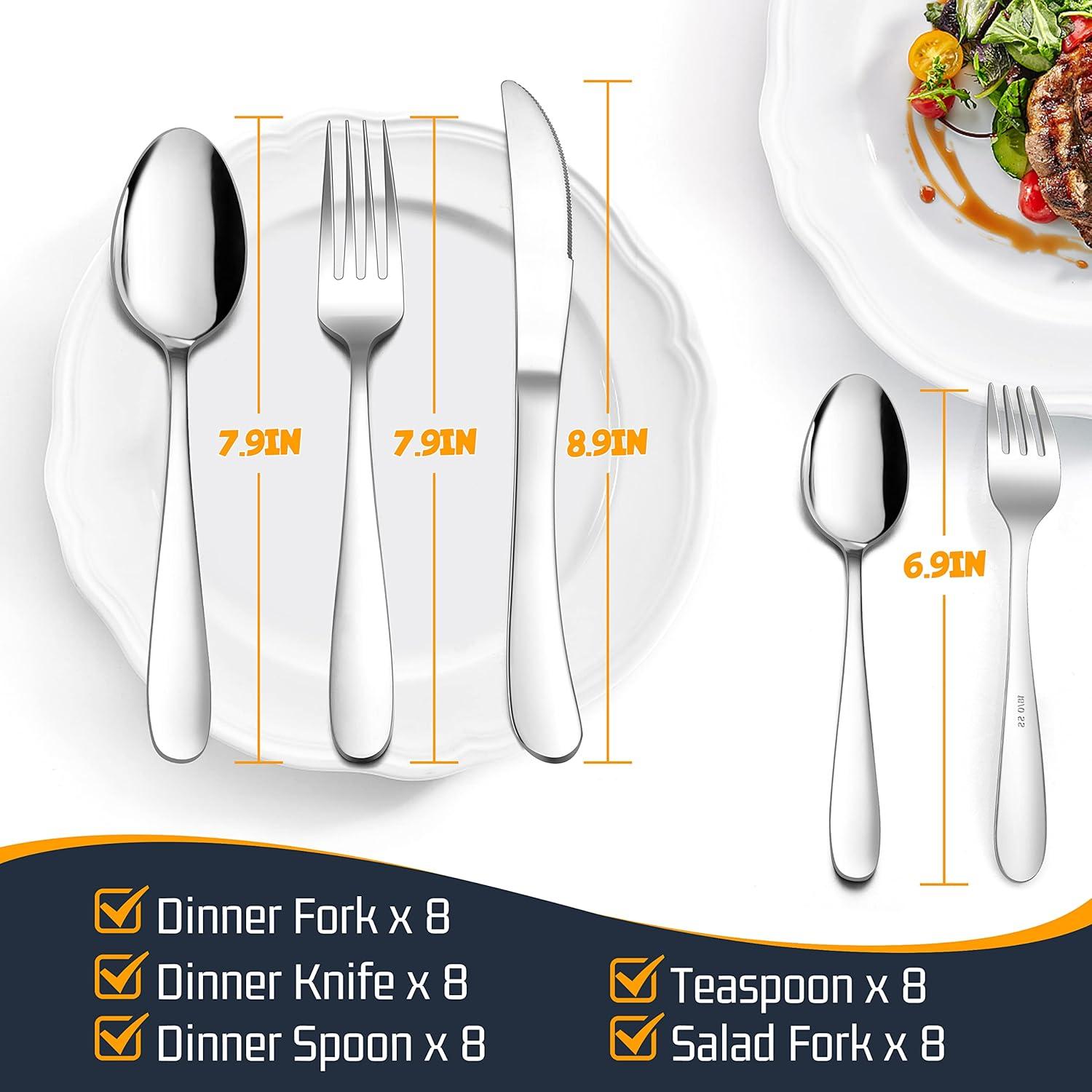 FLATWARE SET FOR 8: Complete service includes 8 each of Dinner Spoons, Dinner Forks, Dessert/Teaspoons, Salad/Dessert Forks and Dinner Knives, Serrated dinner knives are sharp as steak knives, Ideal for cutting meat, Perfect balance of completeness and storage convenience