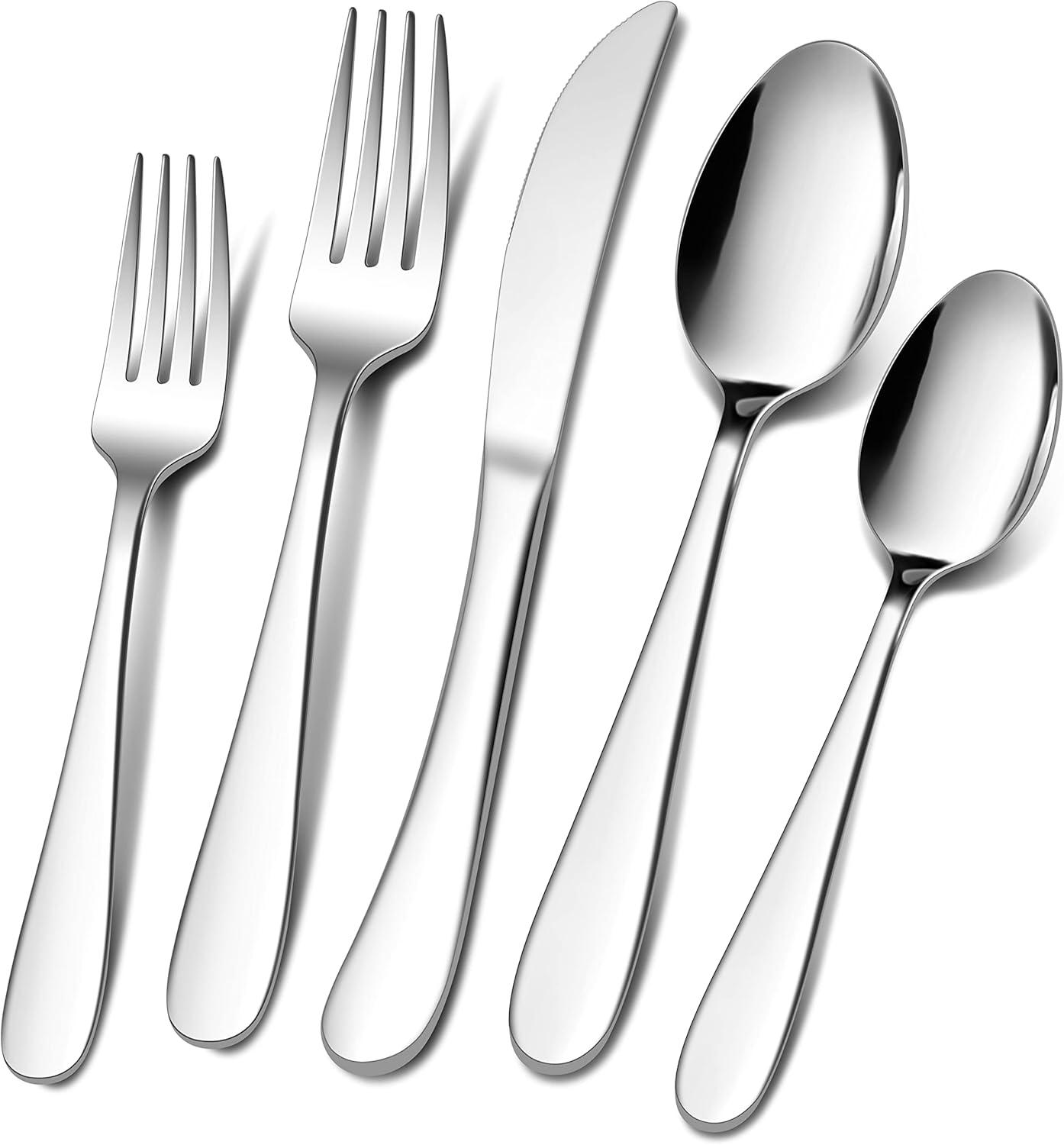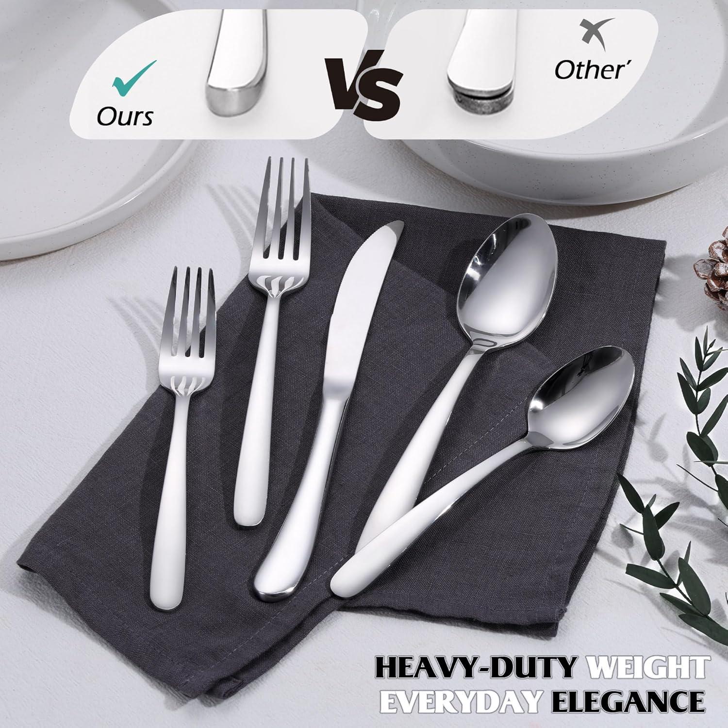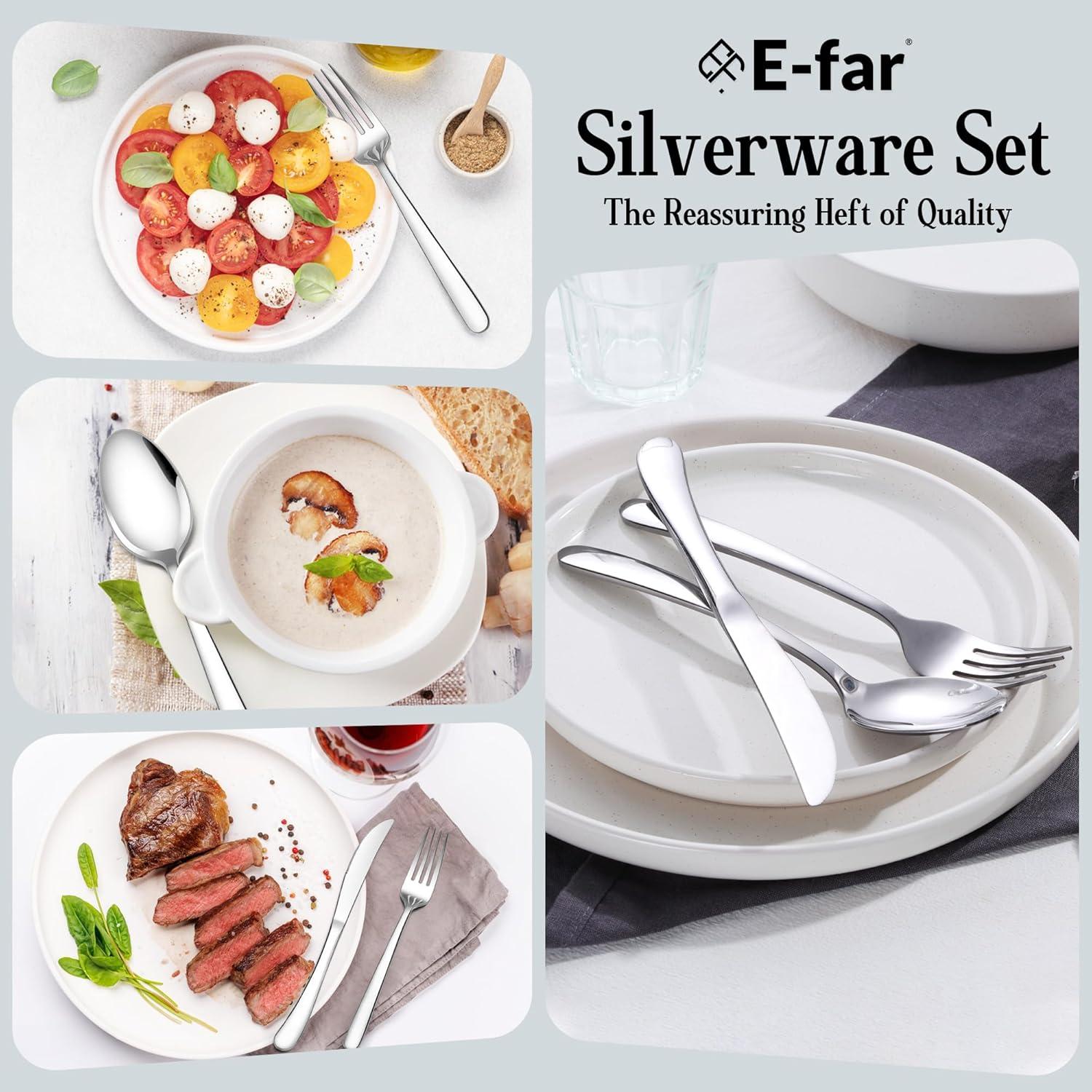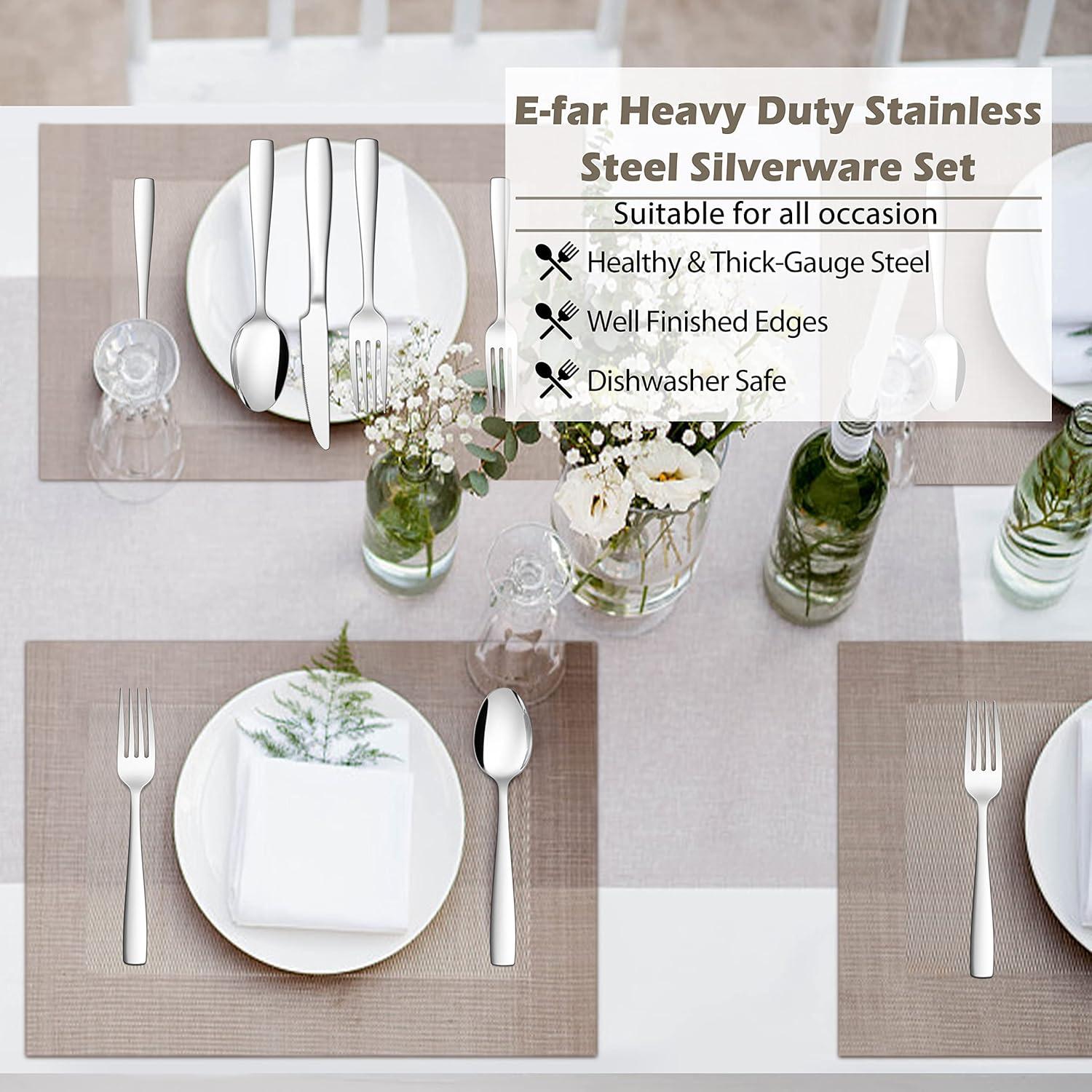 E-far Silverware Set for 8 | 40-Piece Heavy Duty Stainless Steel Flatware Cutlery Set, Metal Eating Utensils Includes Spoons and Forks Knives, Mirror Polished & Dishwasher Safe(60)