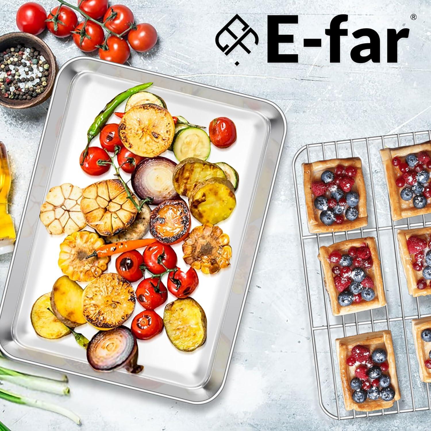 FOOD-GRADE STAINLESS STEEL: E-far 18/0 baking sheet pan is non-toxic and coating-free, Healthy and safe for high-heat baking, Commercial-grade steel offers superior hardness, durability and resistance to corrosion, Rust and discoloration compared to aluminum pans