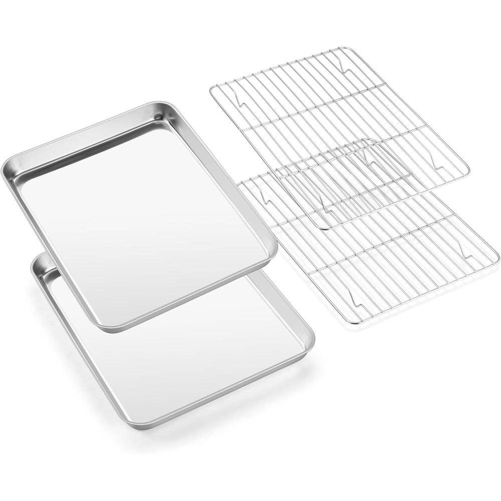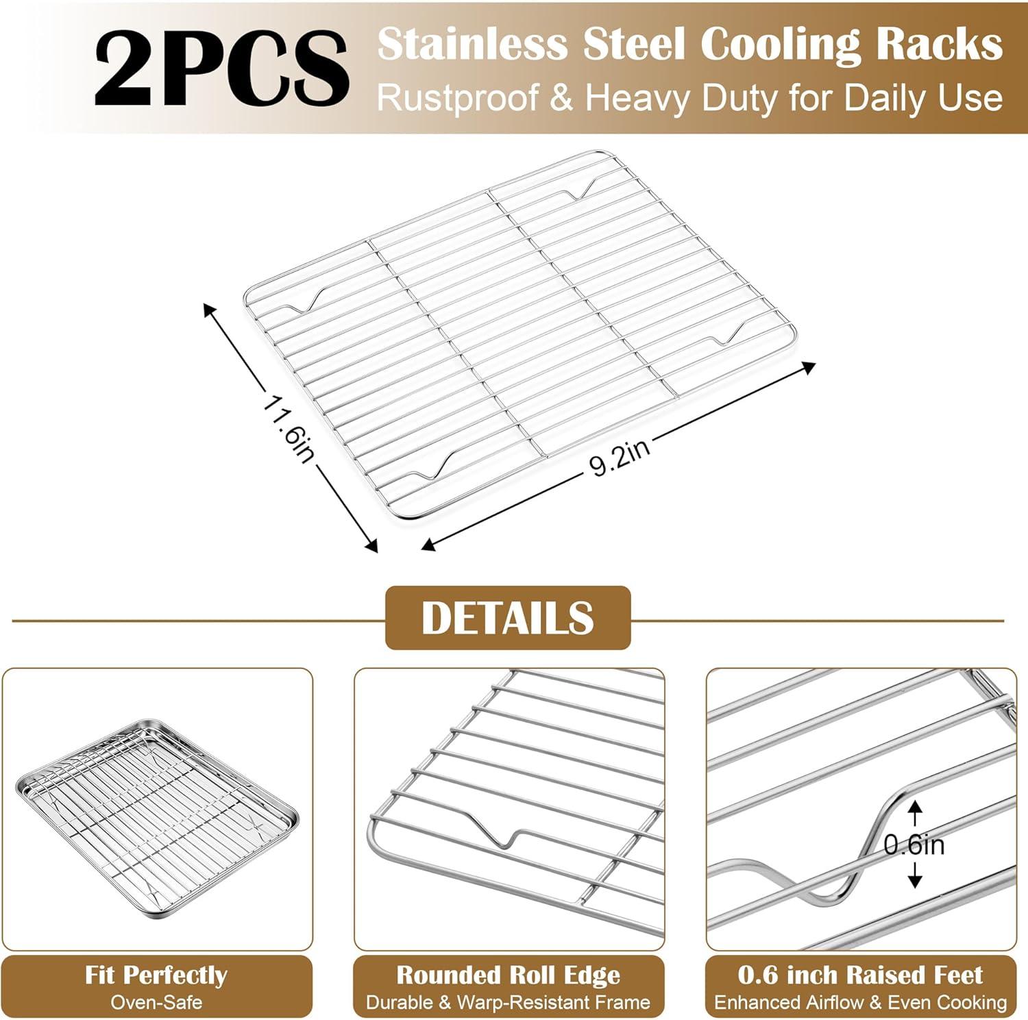 MULTI-PURPOSE SET: Include 2 baking sheets(10.5’’ x 8.3’’ x 1’’) and 2 cooling racks(7.7’’ x 7.3’’ x 0.6’’), Compact size fits perfectly in toaster oven or air fryers, Ideal for baking cookies and roasting vegetables to cooking bacon, Reheating leftovers or serving small dishes