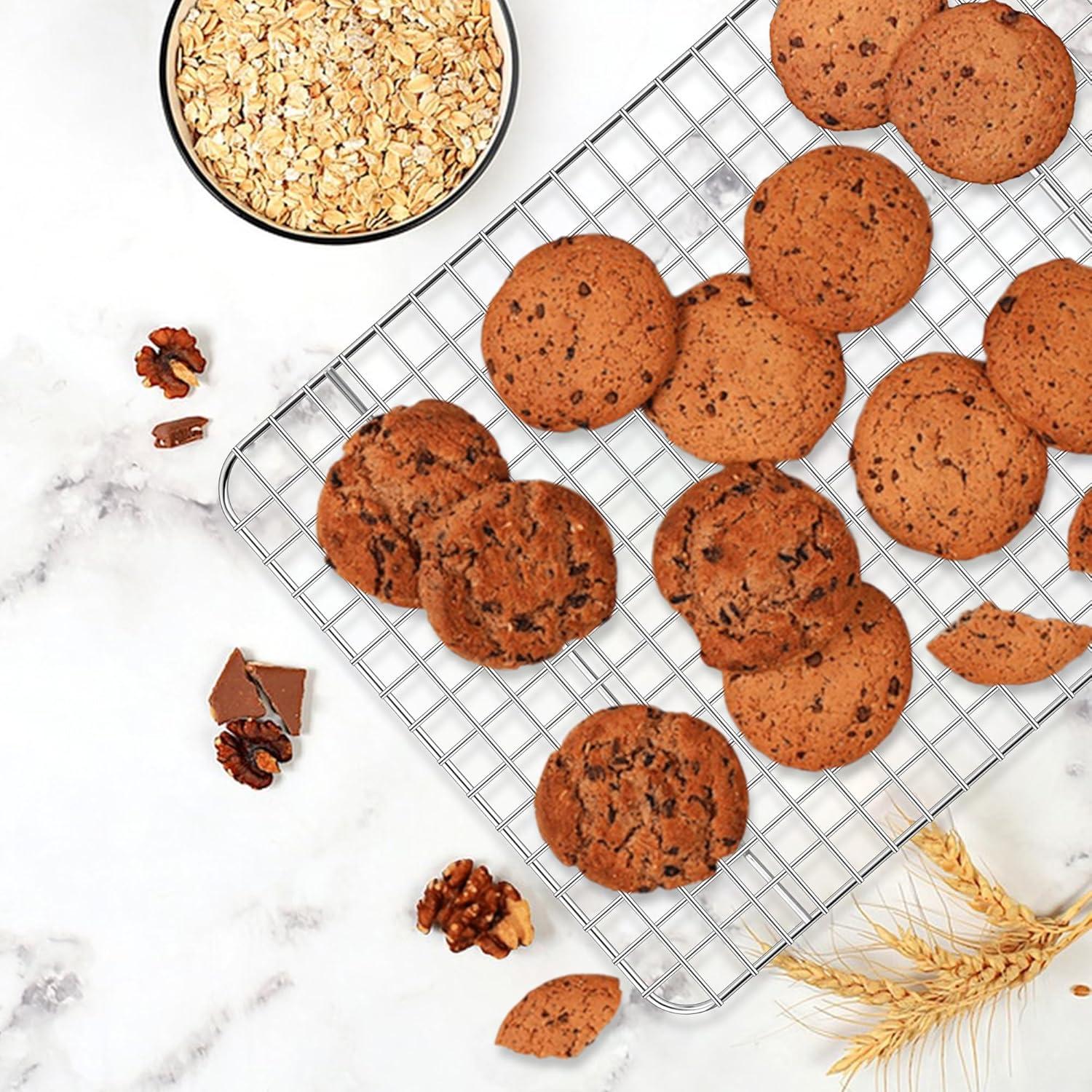 EXQUISITE CRAFT: Made of thick gauge metal resistant to high temperatures up to 450°F, It is not easy to warp when used in the oven, The flat bottom design makes the cake evenly heated, Grid wire rack has 6 raised legs to raise food from pans or countertop for increased air circulation and cook evenly, Tight grid spacing prevents small items from falling out
