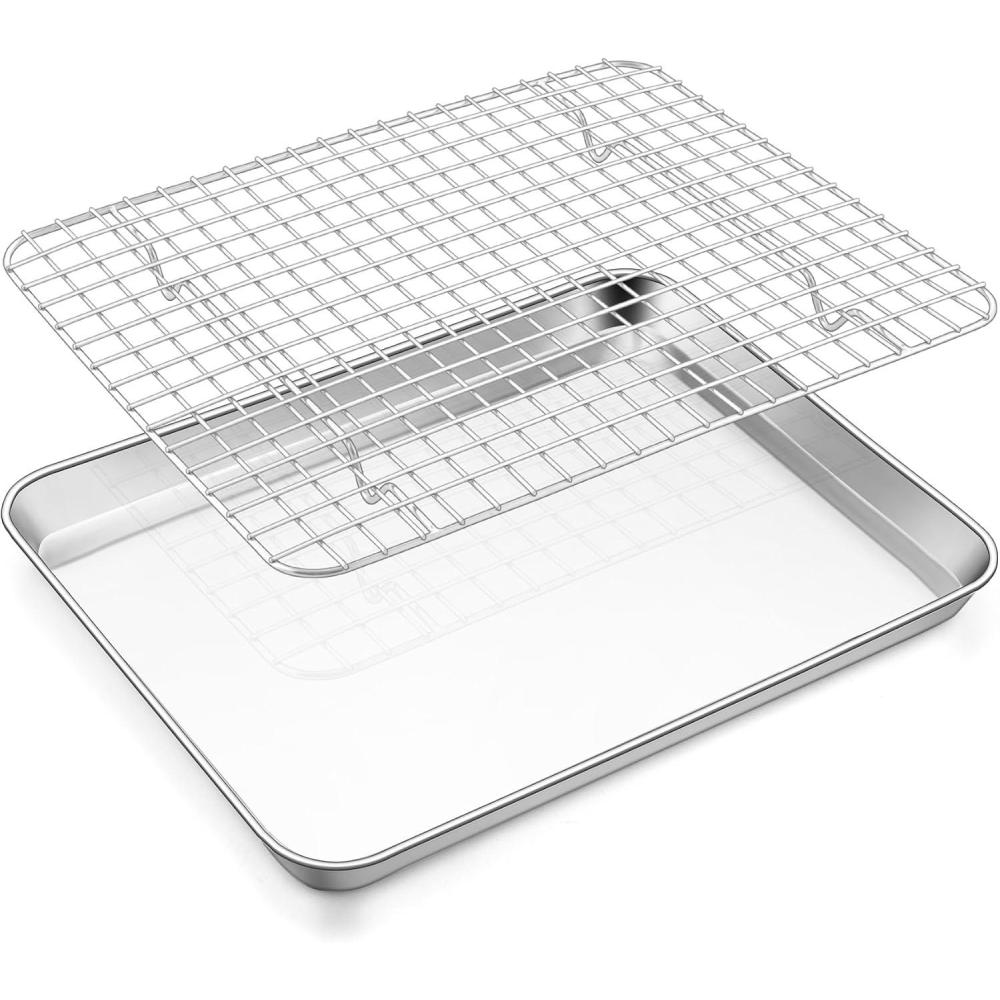 E-far Stainless Steel Baking Sheet with Wire Rack Set, 16” x 12” Cookie Sheet Baking Pan for Oven, Rimmed Large Metal Tray with Cooling Rack for Cooking Roasting, Non-Toxic & Dishwasher Safe(12.5"x9.5")
