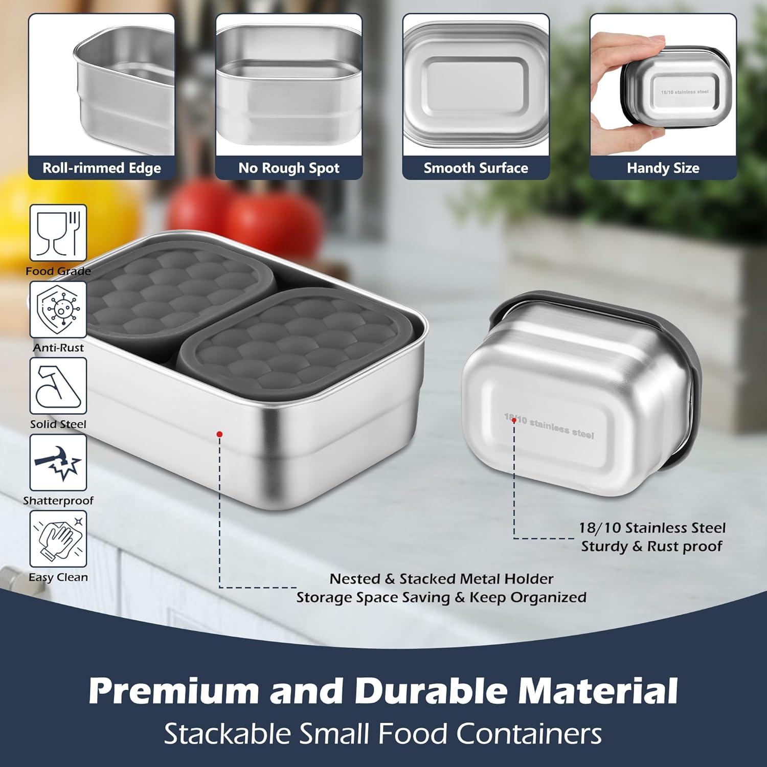 PROPER CAPACITY FOR SMALL APPETITE: Contents include 3 pieces stainless steel snack containers with grey lids, 2 for 8 OZ/230 ML and 1 for 25 OZ/720 ML, Small size and medium weight food container perfect to take different food out, Such as sandwich, fruit, yogurt, nuts, candies, vegetables, dipping sauce, dressing, baby food and etc., 3 packs separate snack and lunch boxes suitable for portion control