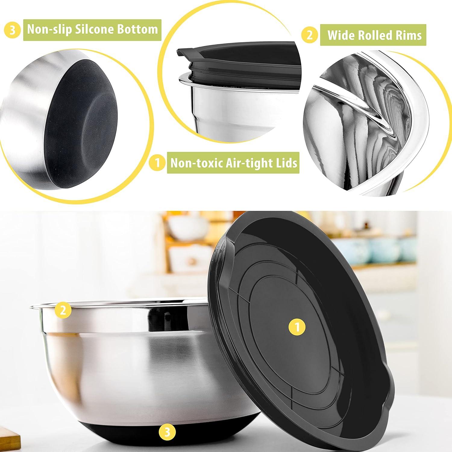 AIR-TIGHT LIDS & SILICON BOTTOM – Flexible black plastic lids fit snugly to keep an airtight seal and keep food fresh, Durable silicon covered bottom helps prevent slipping and loud noise when mixing, One-color only set matches perfectly with any kitchen decor