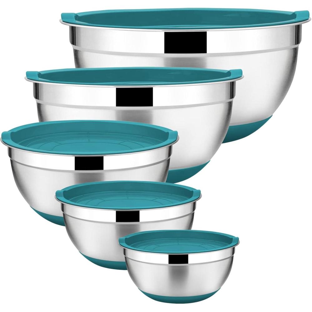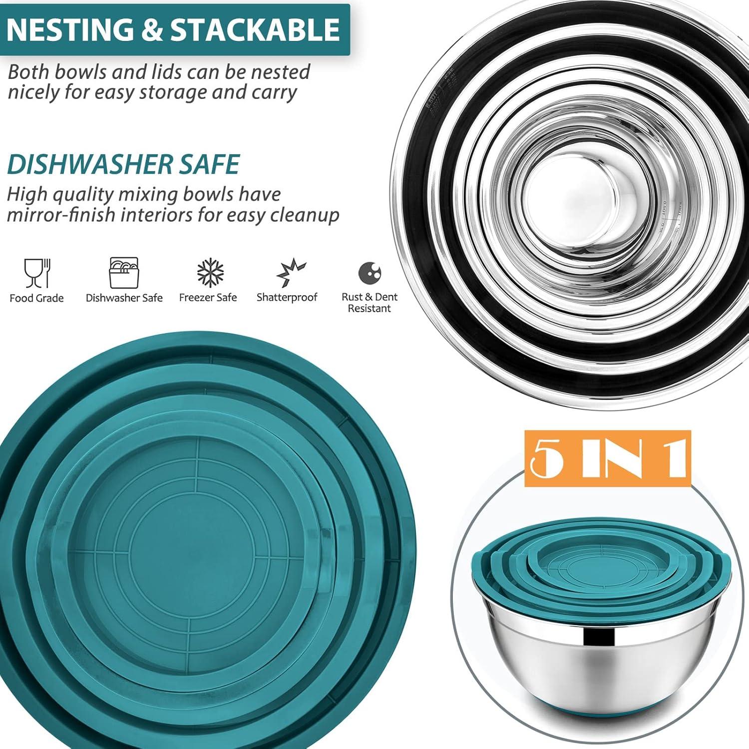 imageEfar Stainless Steel Mixing Bowls Set of 5 Size 73525151 QT Metal Nesting Bowls with Black Airtight Lids ampamp NonSlip Bottoms Great for Kitchen Cooking Baking Serving Food PrepTeal Blaue