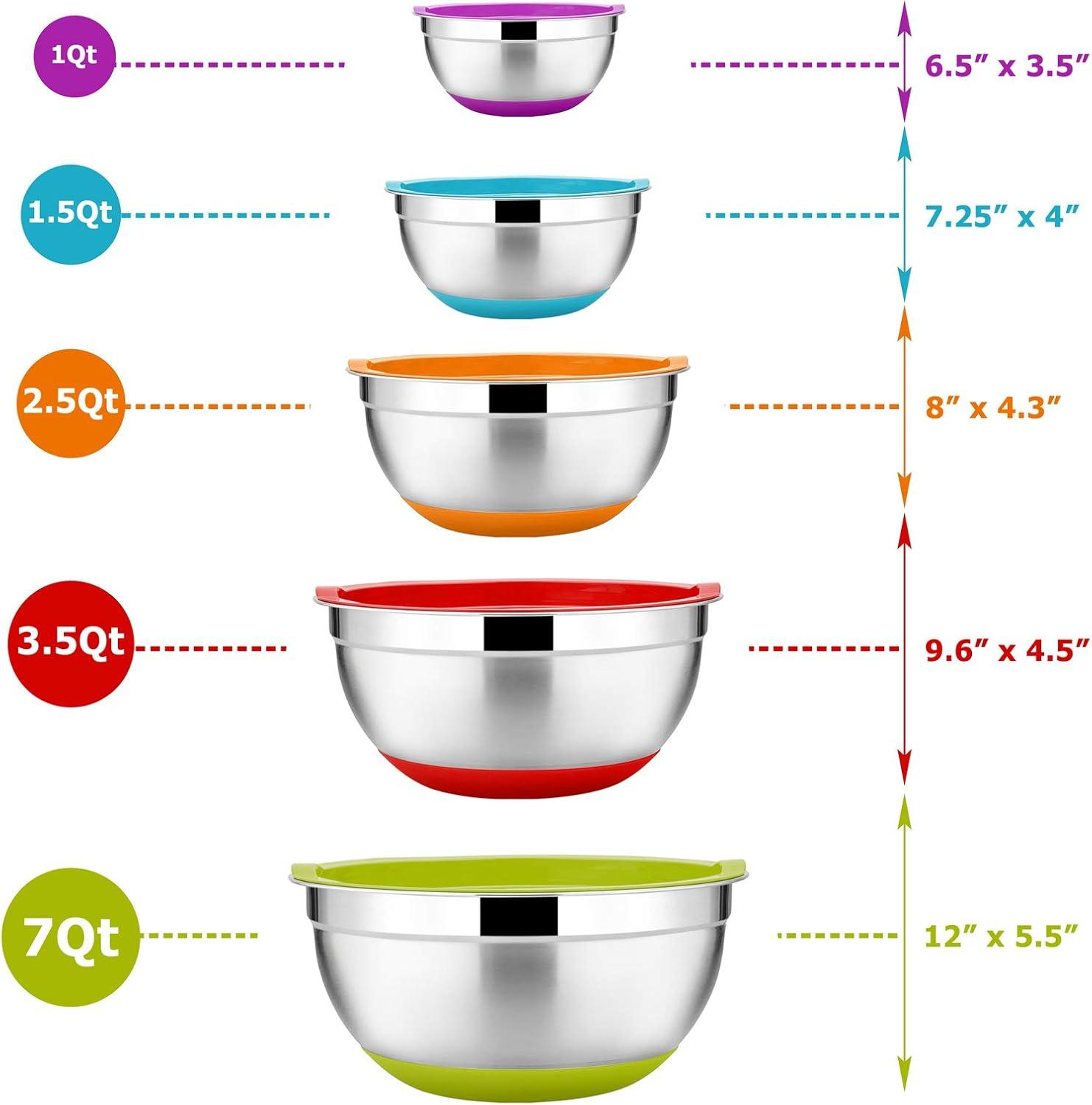 MULTI-USE – 5 different sizes of 1/1.5/2.5/3.5/7 quarts allows you to measure, mix, prepare and serve food all in one kitchen tool, Perfect for mixing, baking, cooking, serving or even as storage bowls, Ideal gift for Christmas, holidays, housewarming and other special occasions