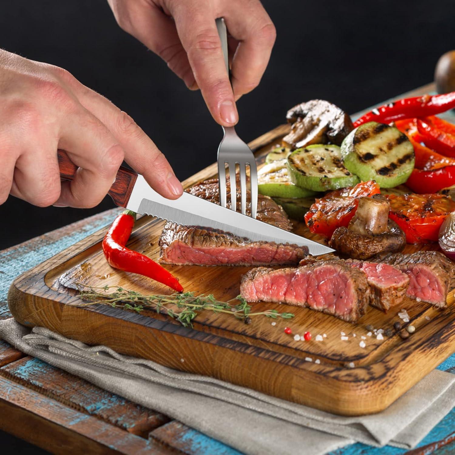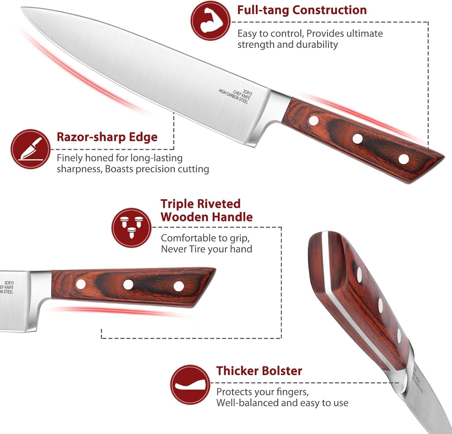 HIGH CARBON STAINLRSS STEEL – All knives’ blade is forged from premium quality high-carbon stainless steel, Creating a stronger, harder blade to resist stains, rust and pitting, Highly polished solid blades with razor-sharp edge for more precise cuts and trimming without tearing foods, Full-tang construction provides ultimate strength and durability