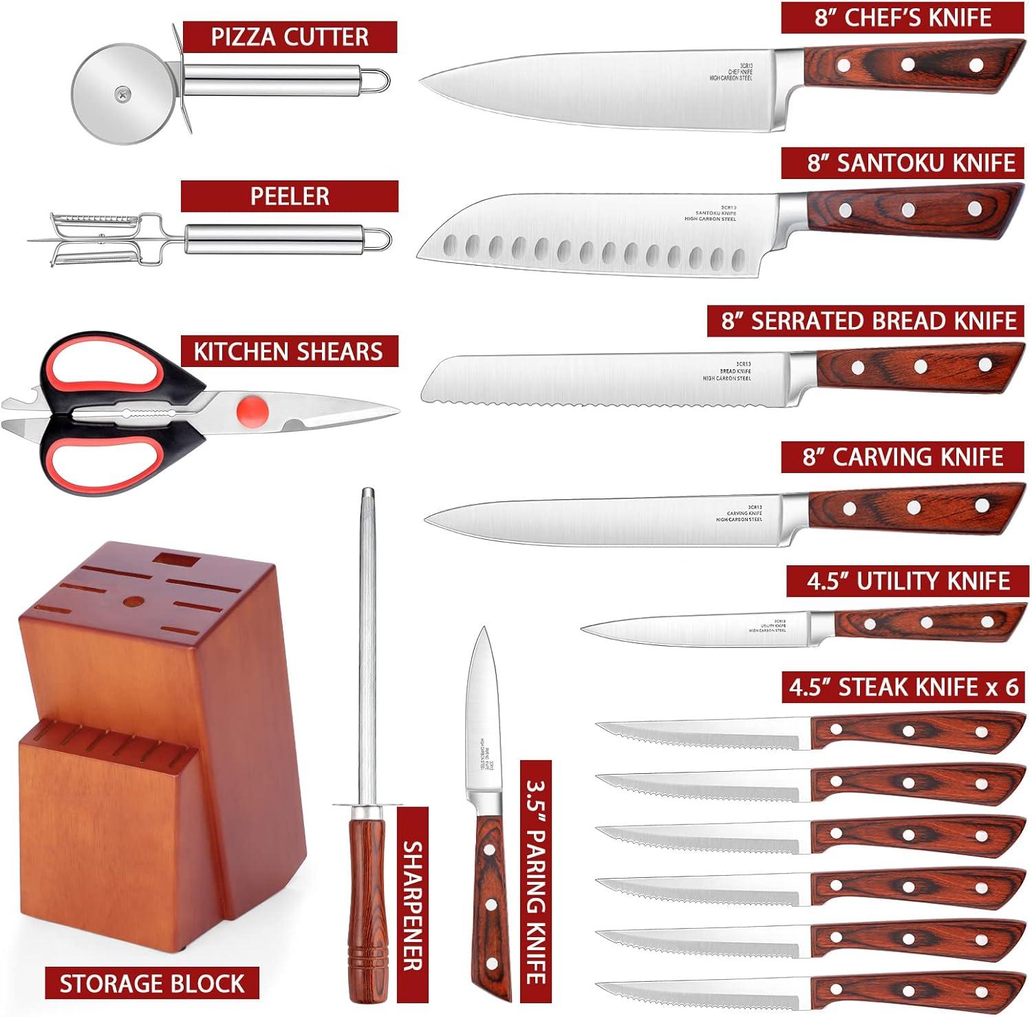Knife Block Set for Kitchen, E-far 17-Piece High Carbon Forged Stainless Steel Knife Set Includes Chef Utility Paring Steak Serrated Bread Santoku Knife Sharpener – Full Tang Design(Triple Riveted Abs Handle)