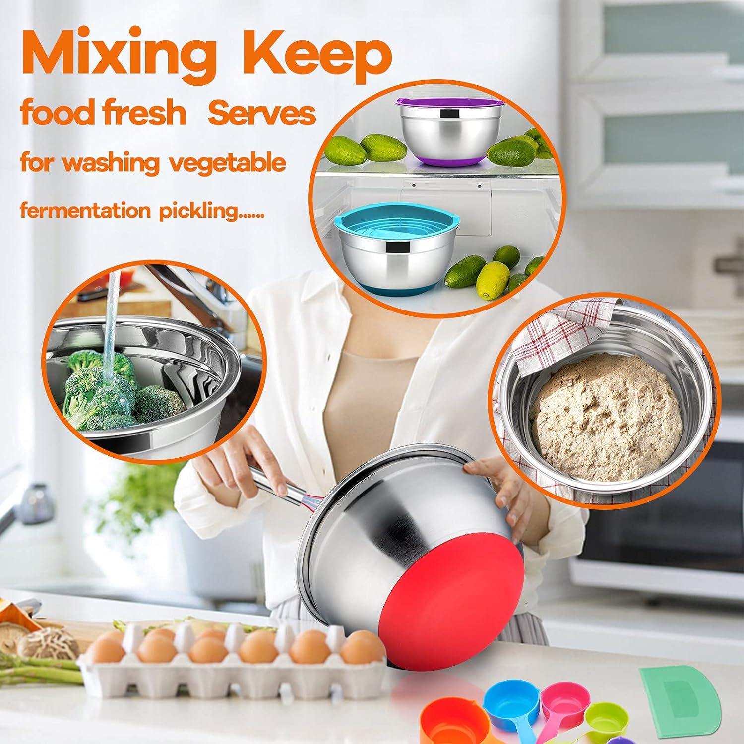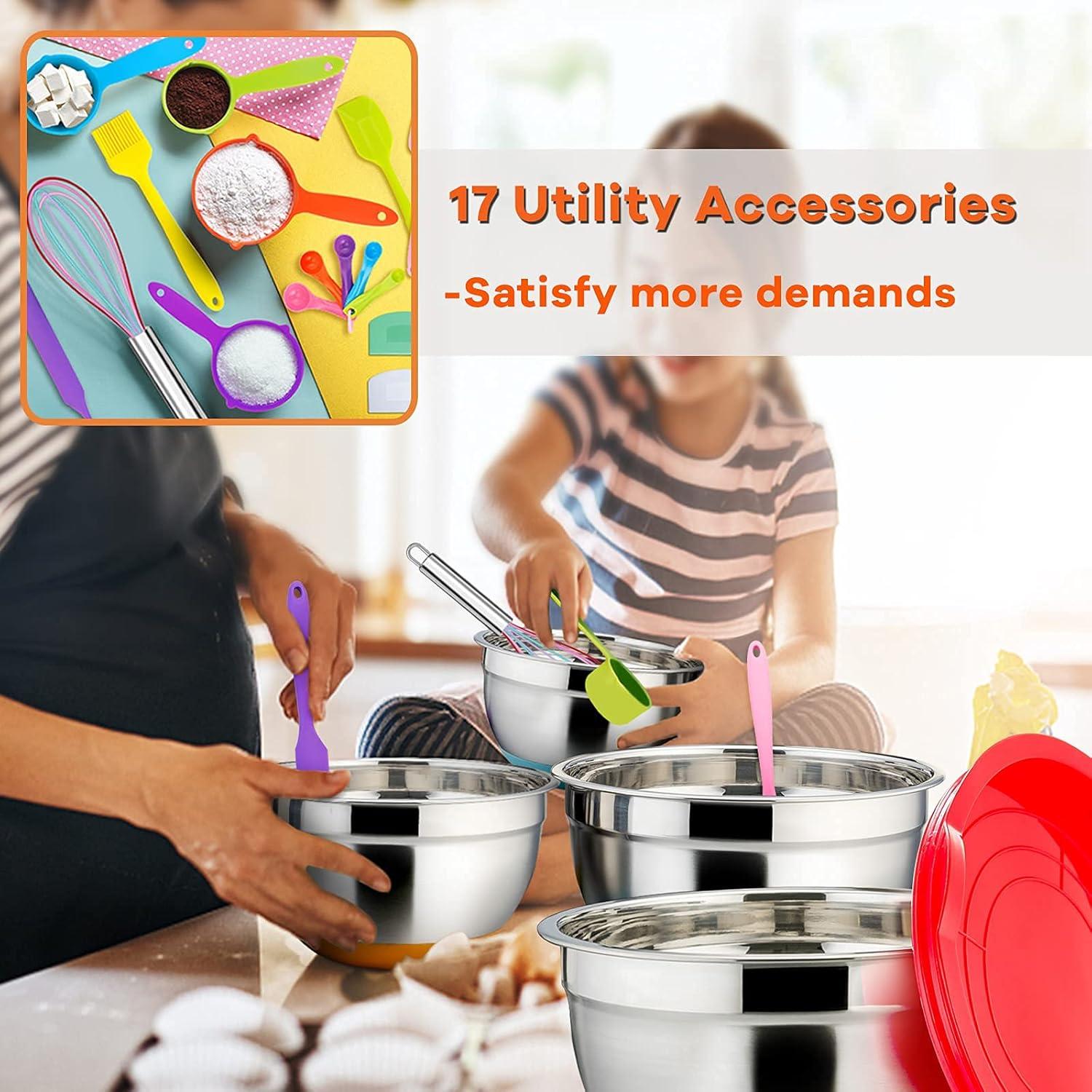 COLORFUL GREAT VALUE MIXING BOWL- Different sizes versatile in preparing, storing or serving salad, 17psc accessories helps with measuring, mixing, brushing, scraping for baking/cooking, One set give your more possibility and meet more demands, Idea gift for housewarming, Christmas, wedding etc