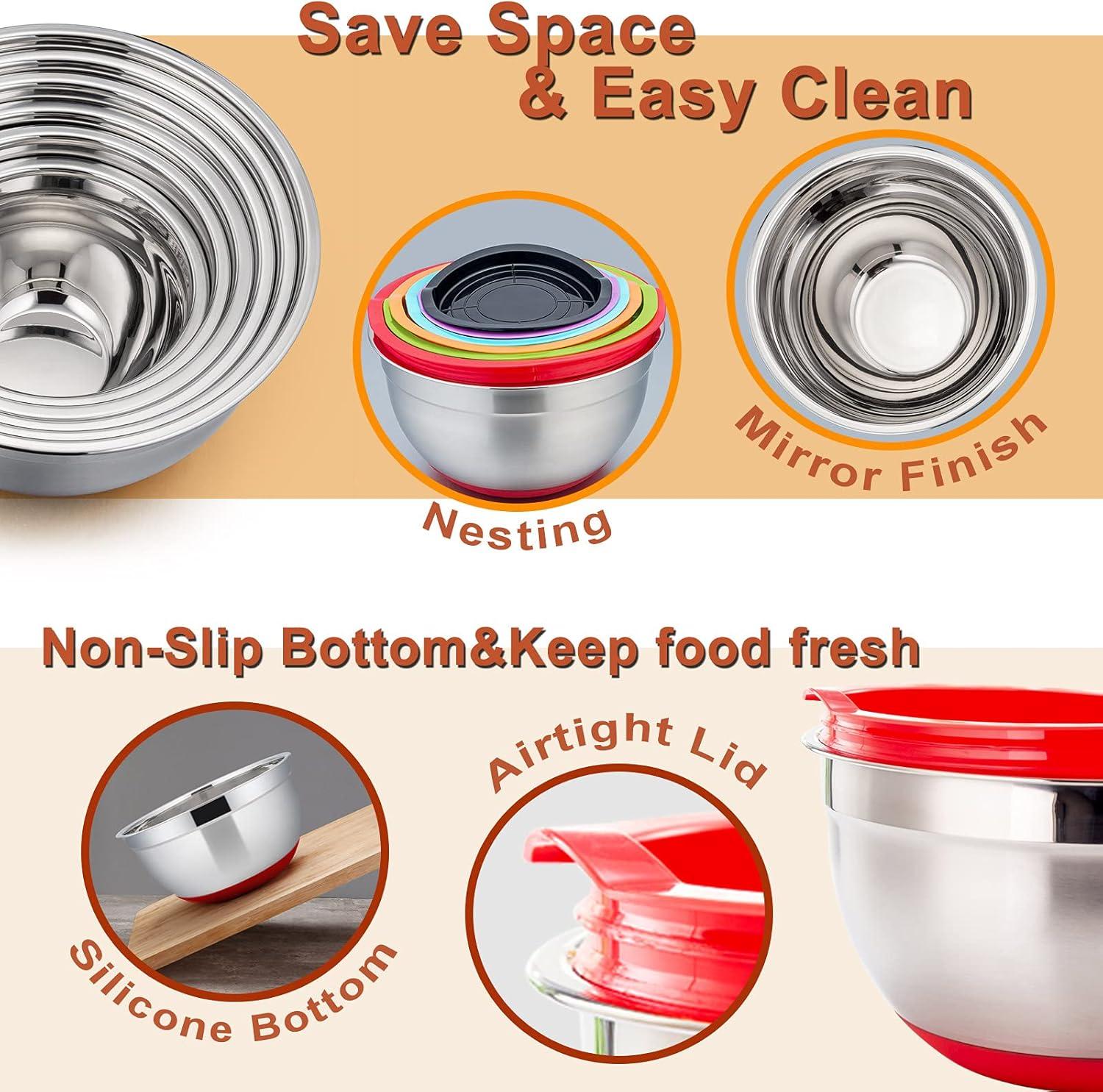 EASY STORAGE & CLEAN- Nesting design easy for stack up together to save storage space, Mirror polished interior no easy trap food and stain resistant, Smooth brush-finish exterior easy to clean up, Premium silicone strong joint with bowl, No easy to loose and durable for repeating washing, The lids need to wash by hands