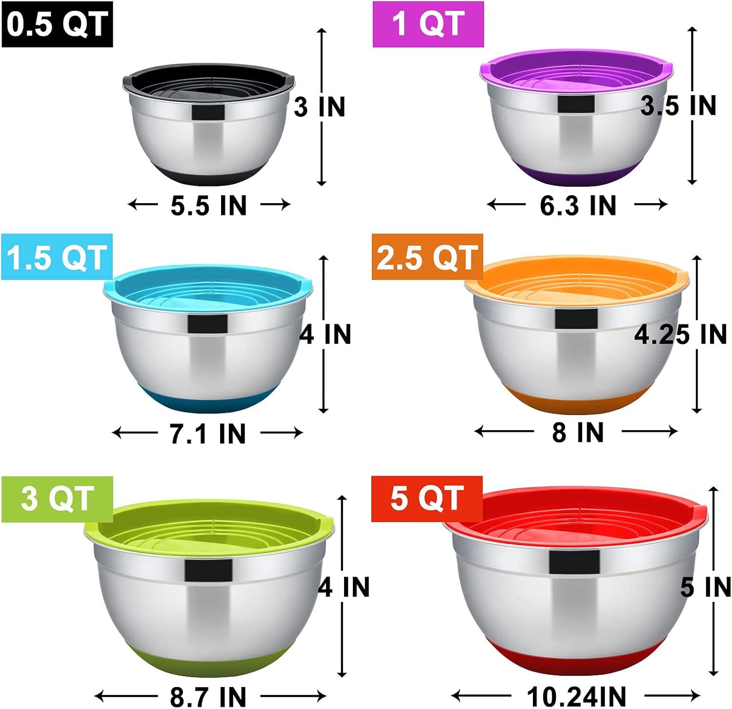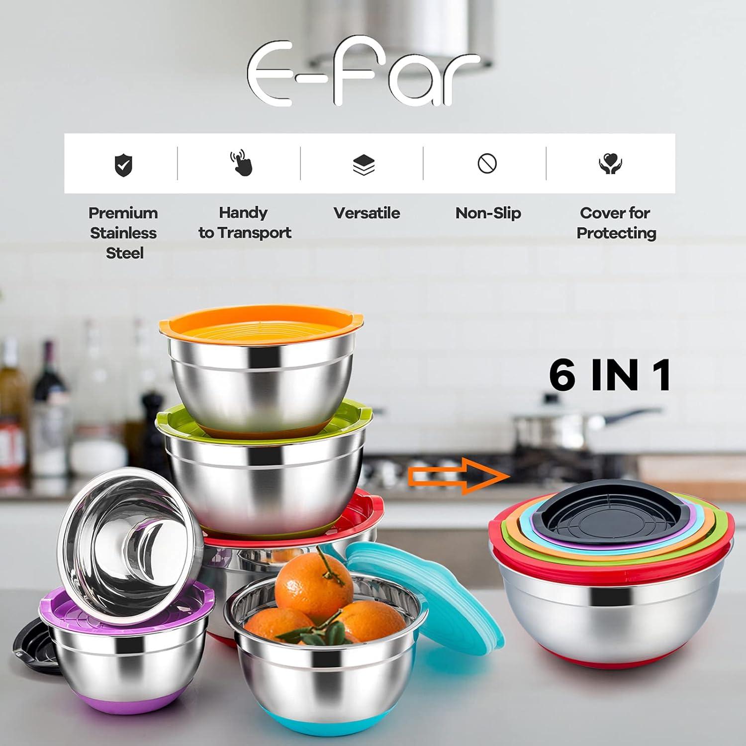 Mixing Bowls with Lids Set, E-far 23-Piece Stainless Steel Nesting Mixing Bowls with Colorful Airtight Lid and Non-Slip Bottoms, Size 5, 3, 2.5, 1.5, 1, 0.5QT, Great for Baking/Mixing/Prepping/Serving