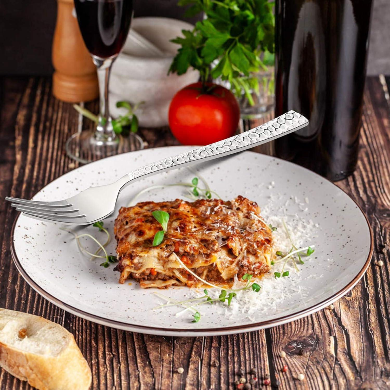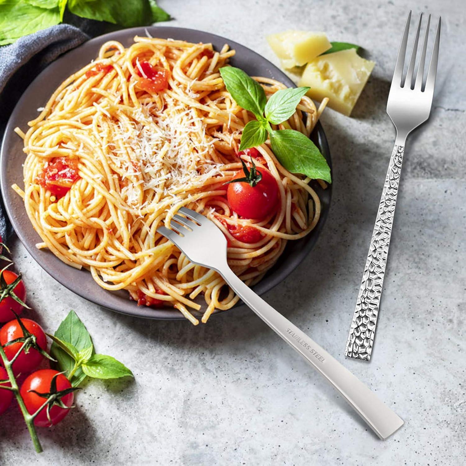 MODERN DESIGN – Hammered salad forks with square edged handle match well with any tableware décor, Great to replace your old existing or missing forks, Elevating your dining experience